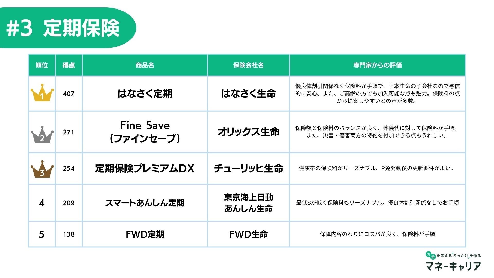 以下、1位から5位までの保険について、保険のプロのコメントを抜粋したものをご紹介いたします。