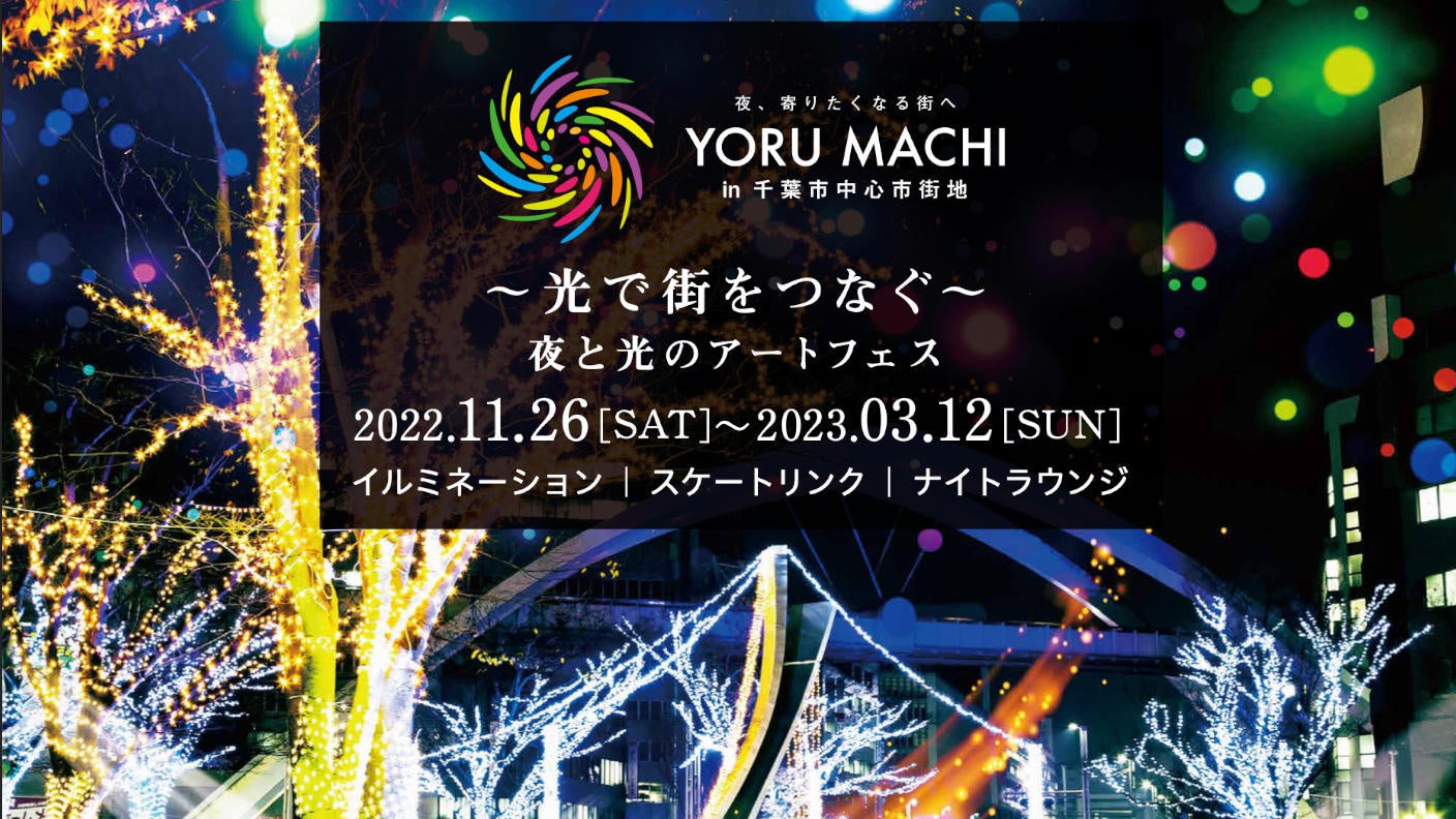 千葉市中央公園で開催されるYORUMACHIは、千葉市中心市街地の夜を楽しくするプロジェクトです。イルミネーションがスケートリンクと融合し、幻想的な空間に。