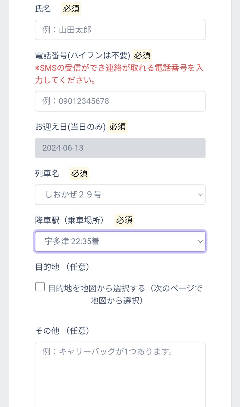 ②タクシー手配フォームに「氏名」「電話番号」「利用日」「列車名」「降車駅」を入力する