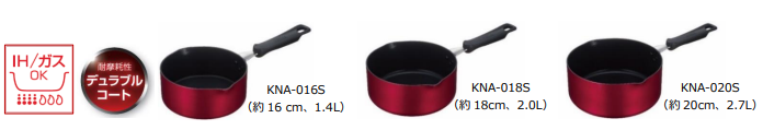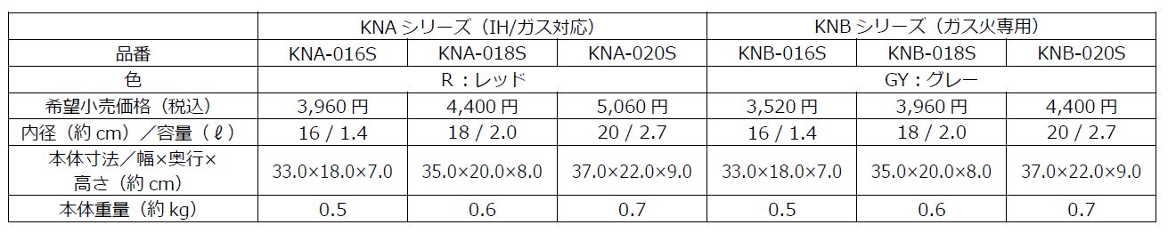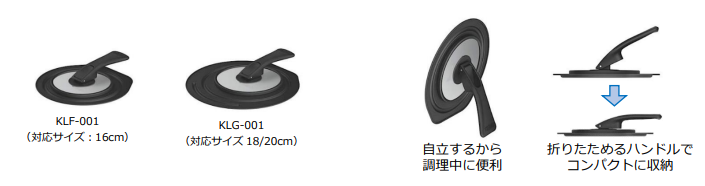 ラインアップは、IH・ガス火対応の『KNAシリーズ』と、ガス火専用『KNBシリーズ』の2種類。サイズはそれぞれ16cm(1.4L)、18cm(2.0L)、20cm(2.7L)の3サイズを展開します。またクックパンに使える『折りたたみスタンド式フタ(KLF-001、KLG-001)』も新発売します。