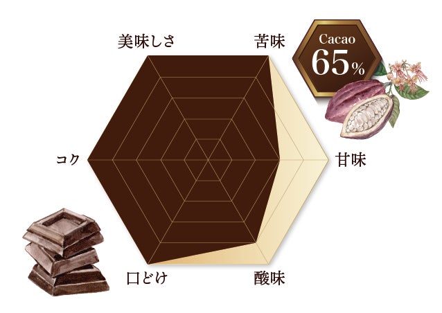 中南米と西アフリカ2つのカカオ豆をブレンドしたカカオ65%のビターチョコレート。スッキリした後味で罪悪感なし!フルーティーな香りと酸味で、チョコ好きにはたまらない高級チョコレートに仕上げました。