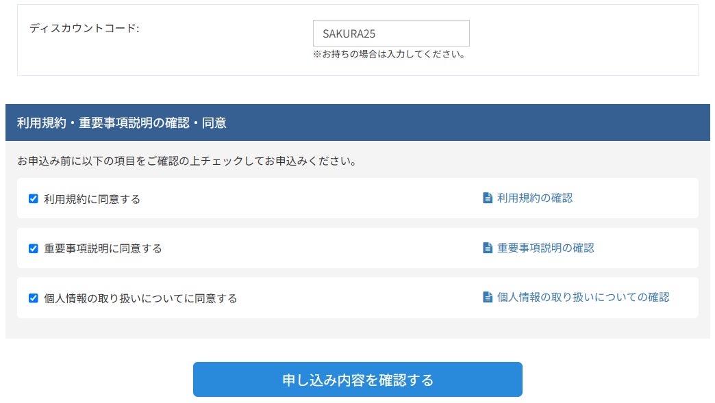 申し込み時にディスカウントコードの欄に「SAKURA25」と入力 |