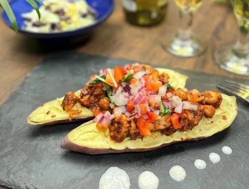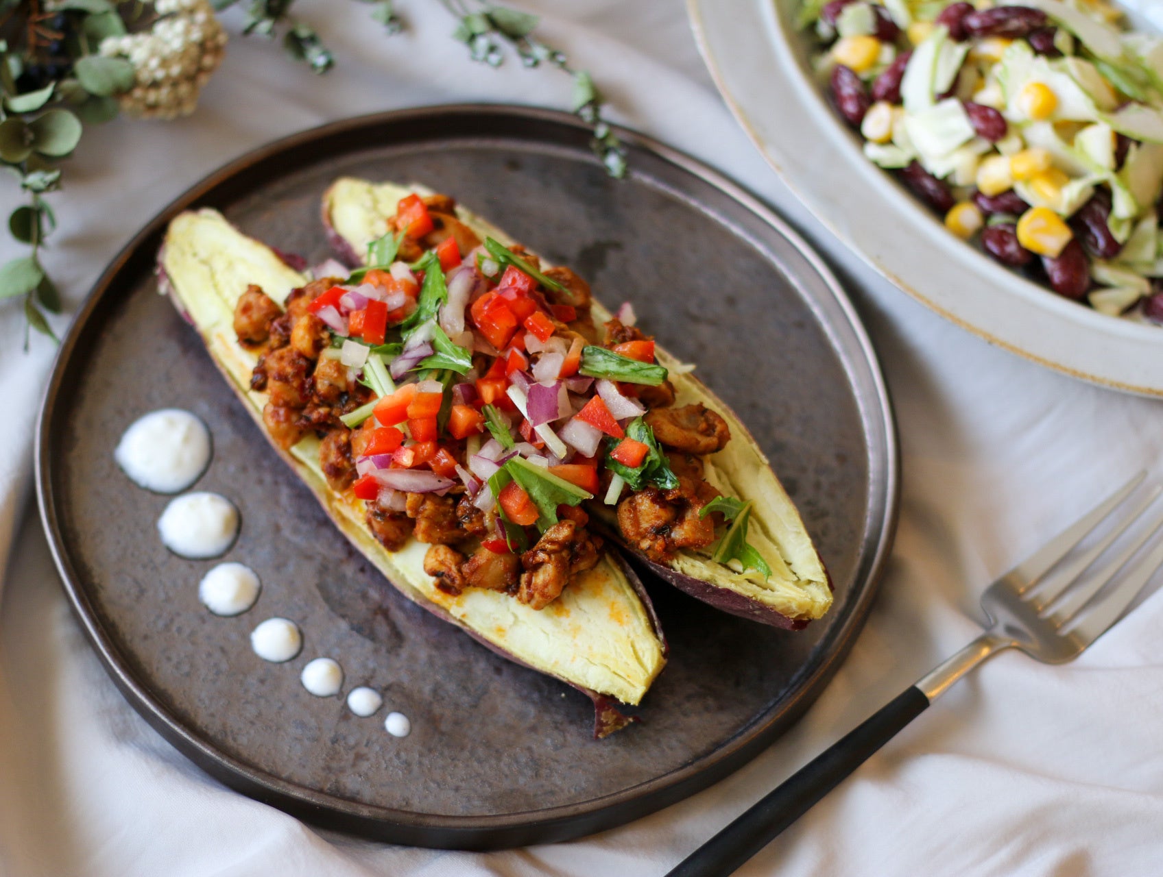 ほんのりとした甘みの「五郎島金時」にスパイシーなチキンローデッドを添えた一品です。