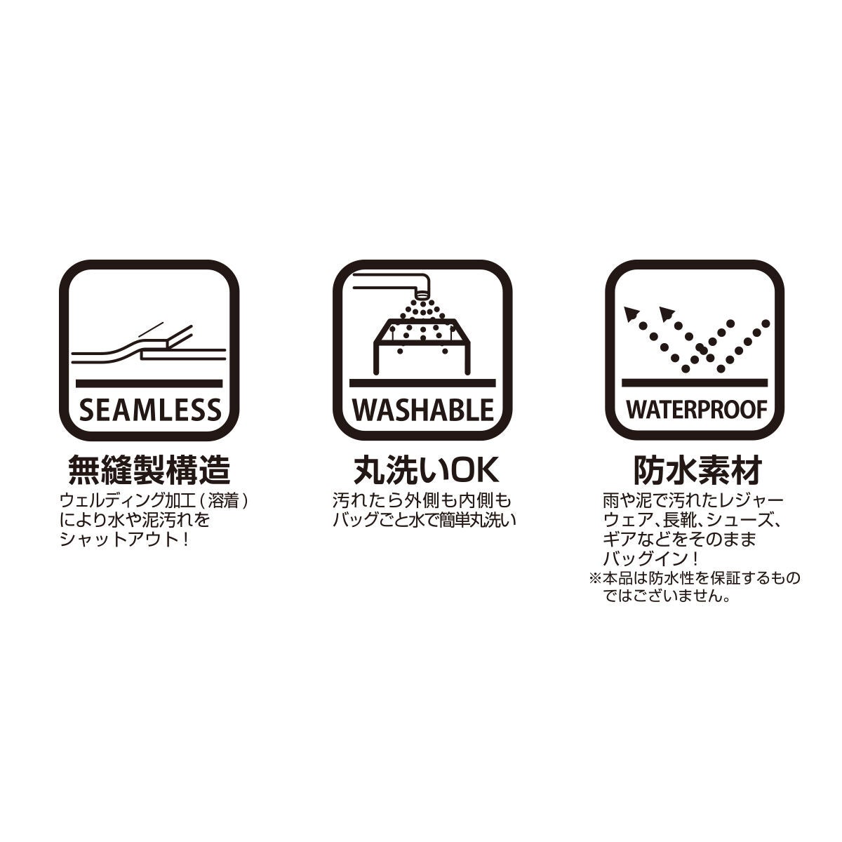 雨や泥等で汚れたレジャーウェア、長靴、シューズ、ギア等をそのままバッグインし、たとえ汚れてしまったとしても外側も内側も丸洗いが可能です。