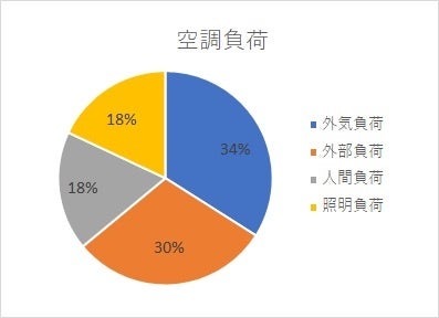 しかし当該施設は、日によってもフロアによっても来場者数に変動があり、全館一律の換気では空調エネルギーのロスが発生します。円グラフの通り、空調負荷のうち約1/3を外気負荷が占めており、換気による過剰な外気導入を抑えることはエネルギーの削減へと繋がります。