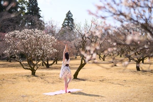 リソルの森の梅園にて、お花見ピクニックとヨガを楽しめる体験プログラム「お花見ヨガ」を開催いたします。