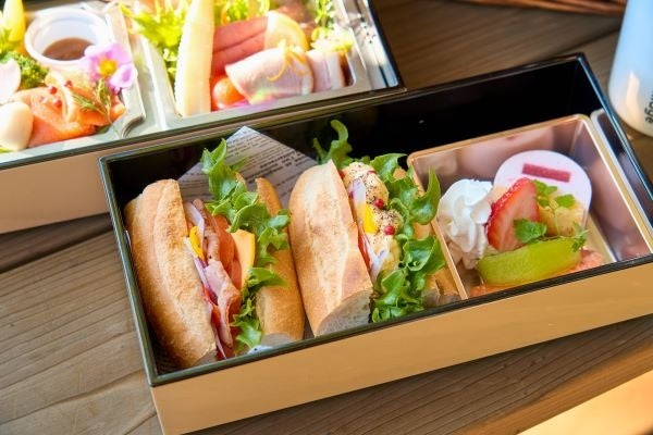 そんな梅園でのお花見ピクニックをより気軽に楽しんでいただけるようにと、2022年より「梅のピクニックBOX」の販売を開始しました。春の彩り豊かな食材をふんだんに使用し、見た目にも心がうらかかになる特別な梅見弁当となっています。今年は、森のサイドウィッチ2種をメインに海老と野菜のテリーヌやローストビーフなど、華やかなオードブルを盛り合わせた「梅のピクニックBOX」をご用意しました。