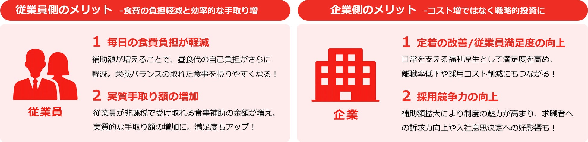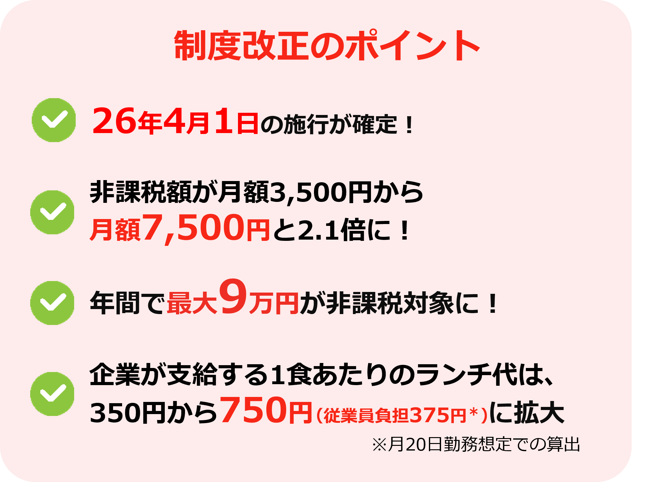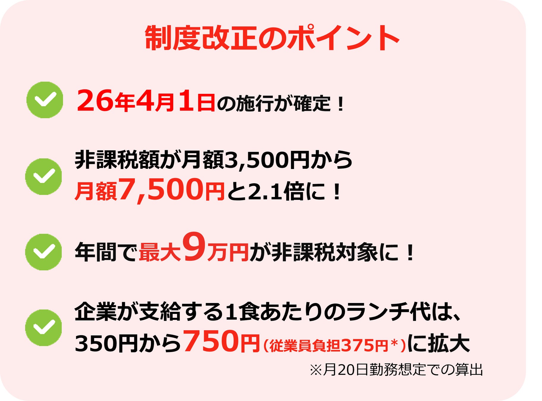 こうした背景を受け、当社は「食事補助上限枠緩和を促進する会」を設立し、要望活動を継続的に実施してきました。その結果、「骨太の方針2025」や税制改正要望に見直しが盛り込まれ、2025年12月の税制改正大綱において非課税上限の引き上げが閣議決定。そして今回、国税庁の通達改正により、2026年4月1日以降の食事補助について、引き上げ後の非課税上限が適用されることとなりました。