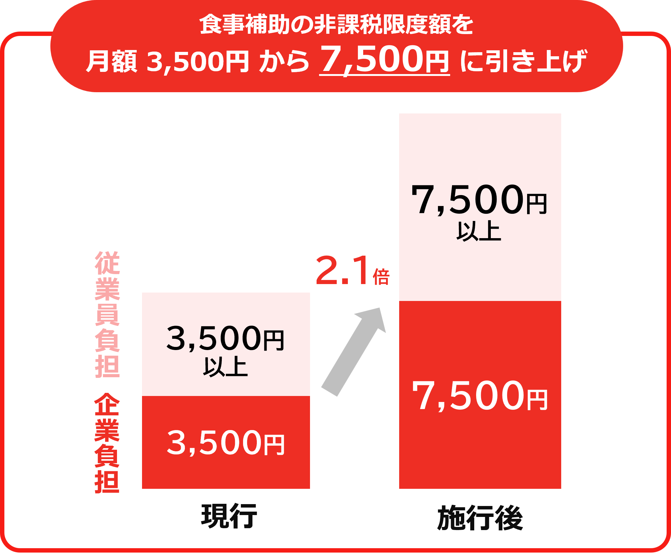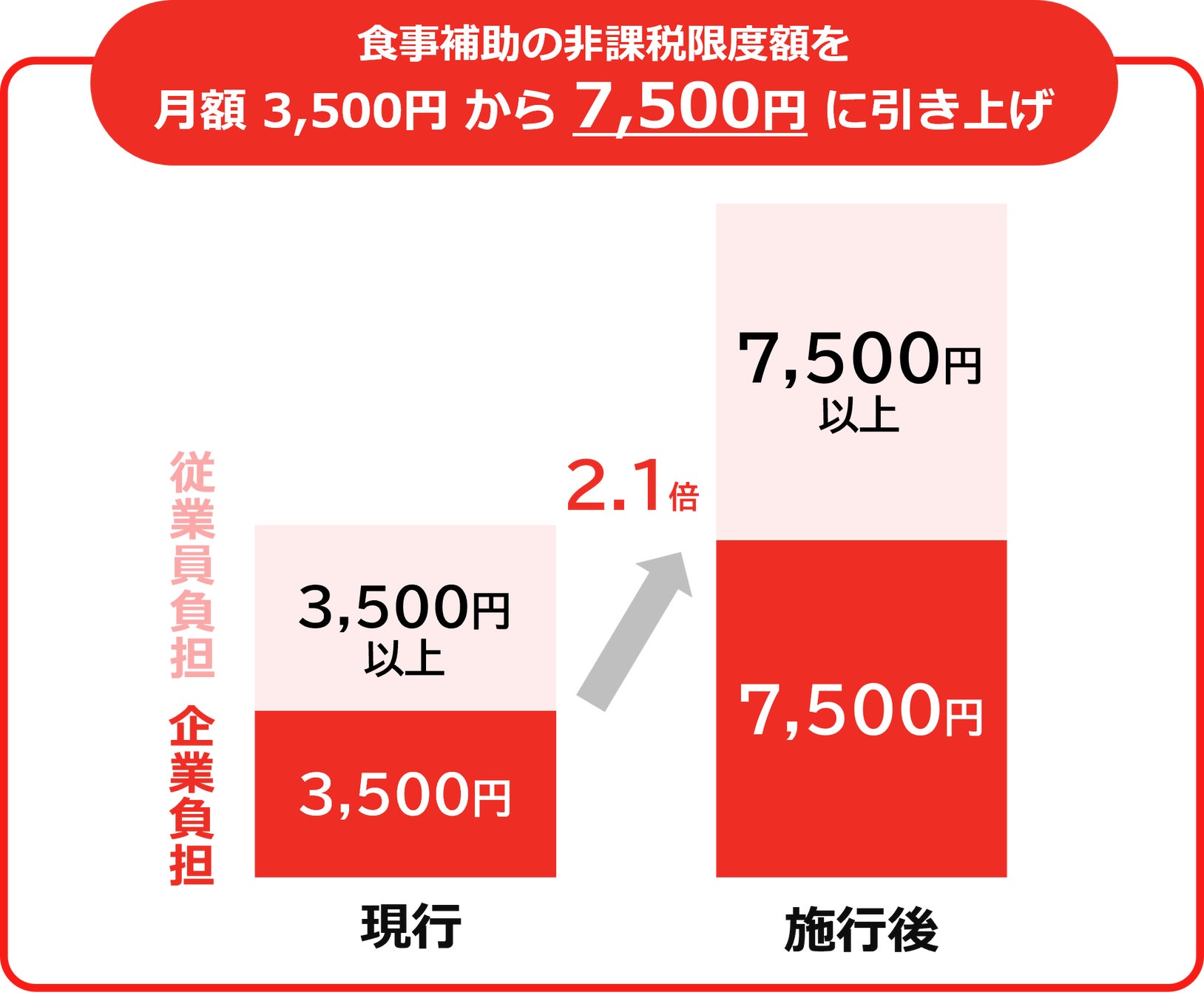 「食事補助制度」の非課税限度額の拡大は、企業が税負担を増やすことなく、従業員の実質的な「手取りアップ」を行える大きな制度改正です。非課税限度額が、月額3,500円から7,500円に引き上げられると、会社からの支給は最大で毎月1万5000円になります。毎日のランチ代に置き換えると、1食当たり750円(従業員負担375円※)となるため、非常に大きなサポートとなります。