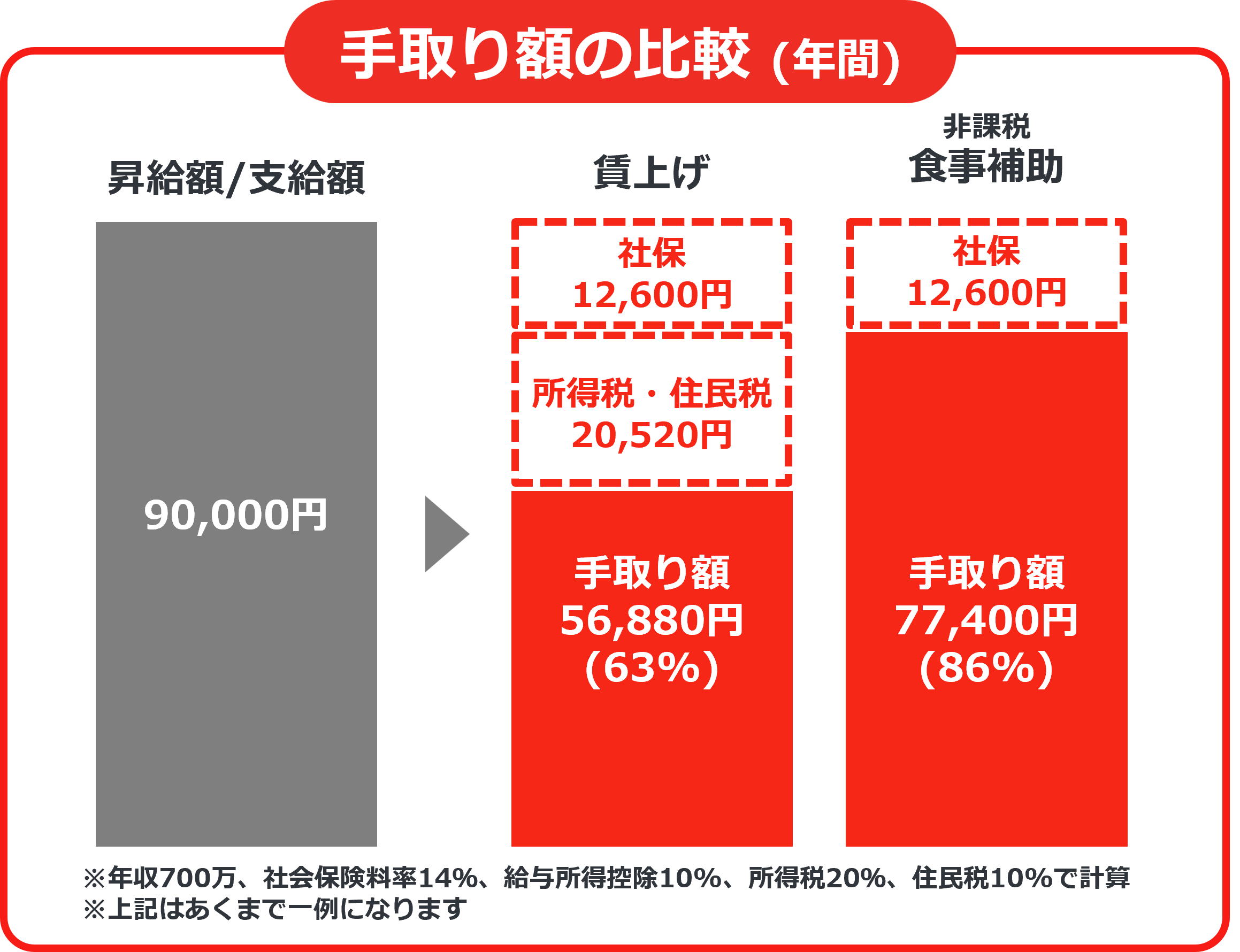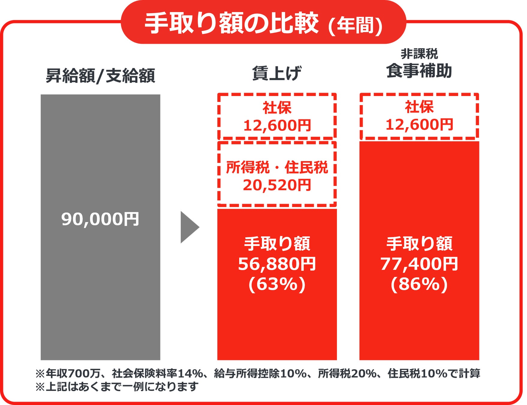 このように、賃上げと食事補助では実質的な手取り額に大きな差が生じます。