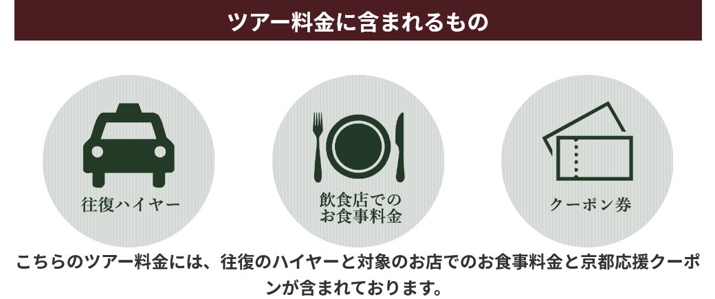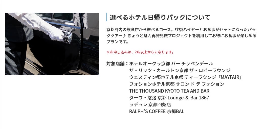 京都府内の飲食店から選べるコース。往復ハイヤーとお食事がセットになったパックツアー♪ きょうと魅力再発見旅プロジェクトを利用してお得にお食事が楽しめるプランです。