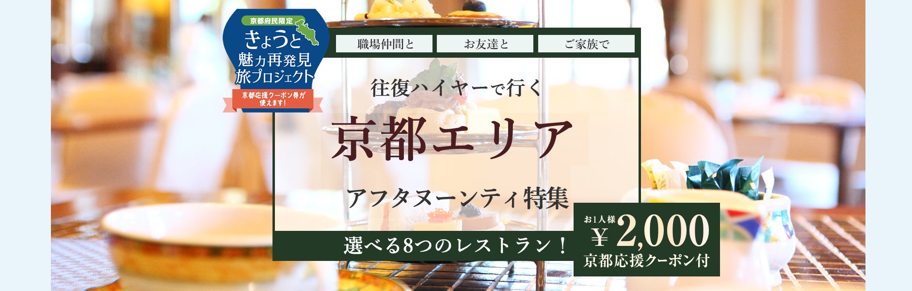 京都府内の飲食店から選べるコース。往復ハイヤーとアフタヌーンティーがセットになったパックツアー♪ きょうと魅力再発見旅プロジェクトを利用してお得にお食事が楽しめるプランです。
