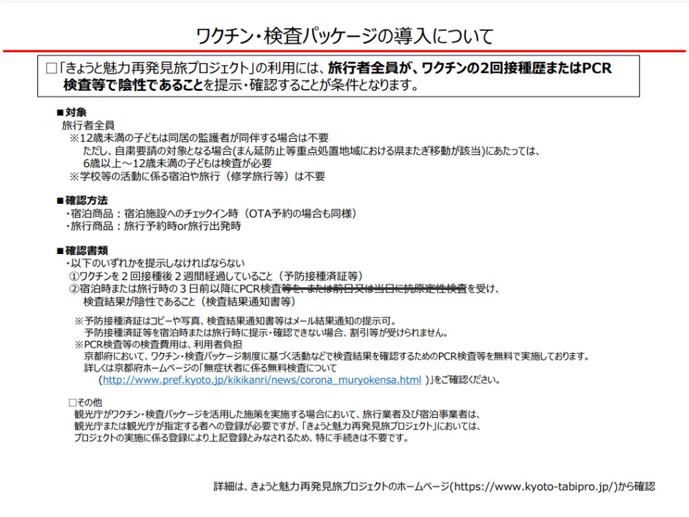 接種済証またはPCR検査等結果通知書(撮影画像、コピー、電子的な証明書でも可)の確認は、同行者も含めて旅行者全員について実施しますので、チェックイン時(旅行会社の場合は予約証明書等お渡しの来店時)にご提示ください。提示のない場合は割引支援を受けることができません。