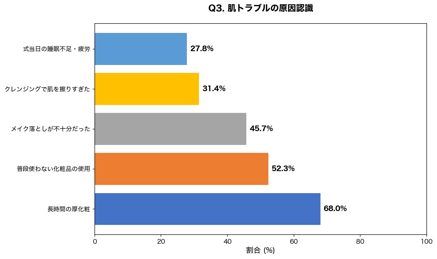 長時間の厚化粧に加え、普段使用しない化粧品への接触、そして疲労による不十分なスキンケアが重なることで、肌トラブルリスクが高まっていることがわかります。