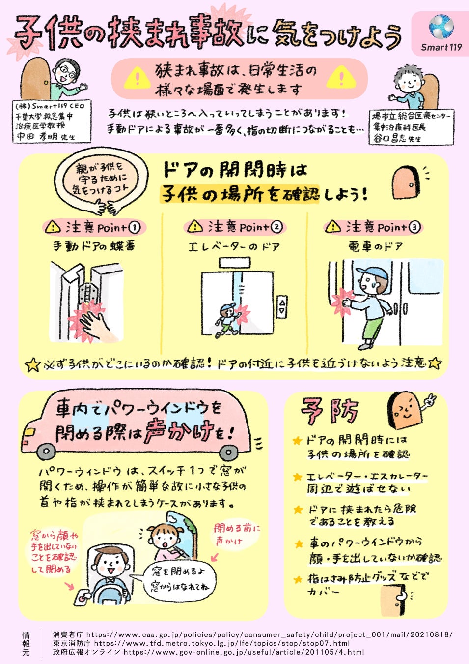 千葉大学発医療スタートアップ企業である株式会社Smart119(本社:千葉県千葉市、代表取締役社長/CEO:中田孝明)は、子供の「挟まれ事故」についてのイラストレーションを、本日一般公開しました。子供は手が小さく、しかも好奇心が旺盛なため、「どうしてそんなせまいところに?」と驚くような場所や隙間に手を伸ばしてしまうことがあります。ドアもその一つで、不意に指を挟まれて怪我をしてしまうケースが発生しています。場合によっては、骨折や指の切断など重大事故につながることがあるため、ドアの開閉時には注意が必要です。救急集中治療医と小児科医の見地から、「挟まれ事故」から子供を守るためのポイントを、親しみやすいマンガで解説します。本資料は学校、企業、公共機関、町内会等で自由に配布・利用していただくことが可能です。