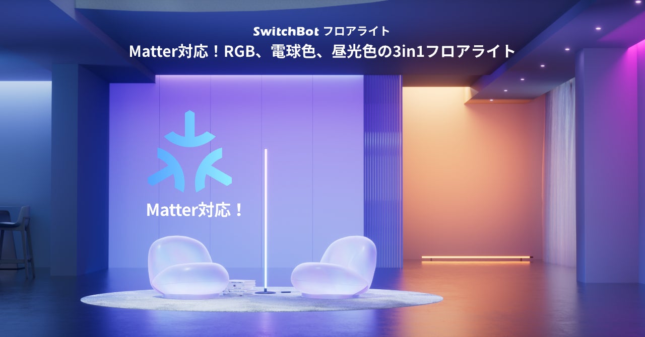 IoT・スマートホーム事業を手掛ける「IoTデバイスNo.1ブランド(*1)」のSWITCHBOT株式会社(本社 : 東京都渋谷区)は、「SwitchBot フロアライト」および「SwitchBot テープライト3」の2製品を新発売。両製品とも、光の三原色を利用した1600万色のカラー(RGB)に加え、電球色、昼光色を自由自在に調光調色可能です。さらに、Matter対応でApple製品のホームアプリから、直接操作することができるように。5月20日(火)よりAmazon公式店舗、SwitchBot公式サイト、楽天公式ストアにて販売を開始。つきましては、5月20日(火)から6月2日(月)の期間中、新発売を記念して割引キャンペーンを実施いたします。
