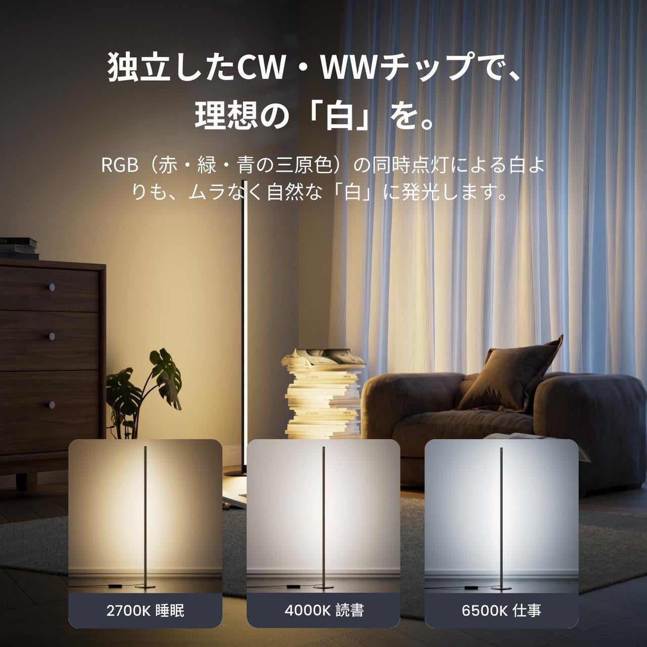 フロアライトもテープライト3も、Matter対応でiPhoneやSiriなどのデバイスから直接操作可能に。また、1600万の色を、そして2700~6500Kの色温度や明るさを、無段階で調節できます。