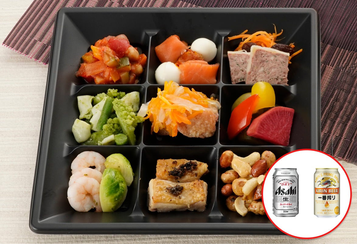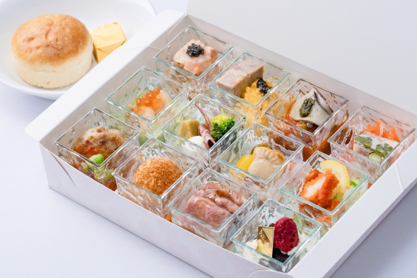 新メニュー「ラグジュアリーBOX」は、銀座クルーズグランシェフの諸星純一氏(株式会社ムーンエレファントジャパン 銀座クルーズ事業部)が監修した12種類の料理が盛り付けられたオードブルセットです。