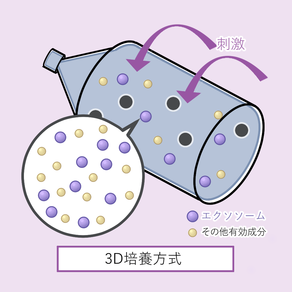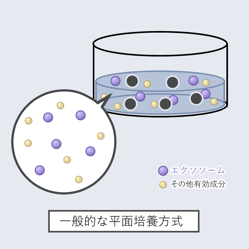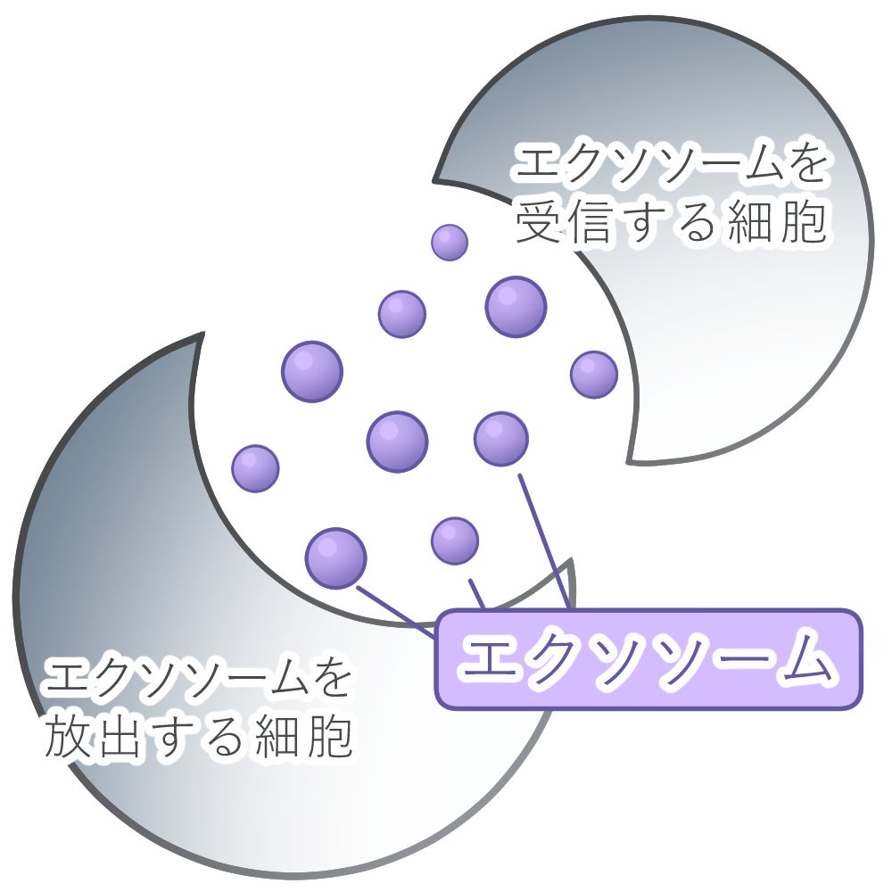 細胞から分泌される小さなカプセルです。近年、エクソソームには有効な成分が含まれているという研究結果が発表されてから注目を浴びています。この小さなカプセルの中には多くの情報が含まれており、細胞間を移動することで体の各所に必要な情報を届けることができます。当社がご提案するエクソソームは、ヒト脂肪由来の幹細胞を培養する際の培養液から幹細胞を取り除いた培養上清液になります。上清液中に様々な有効成分(成⻑因子やエクソソーム)を豊富に含んでいます。