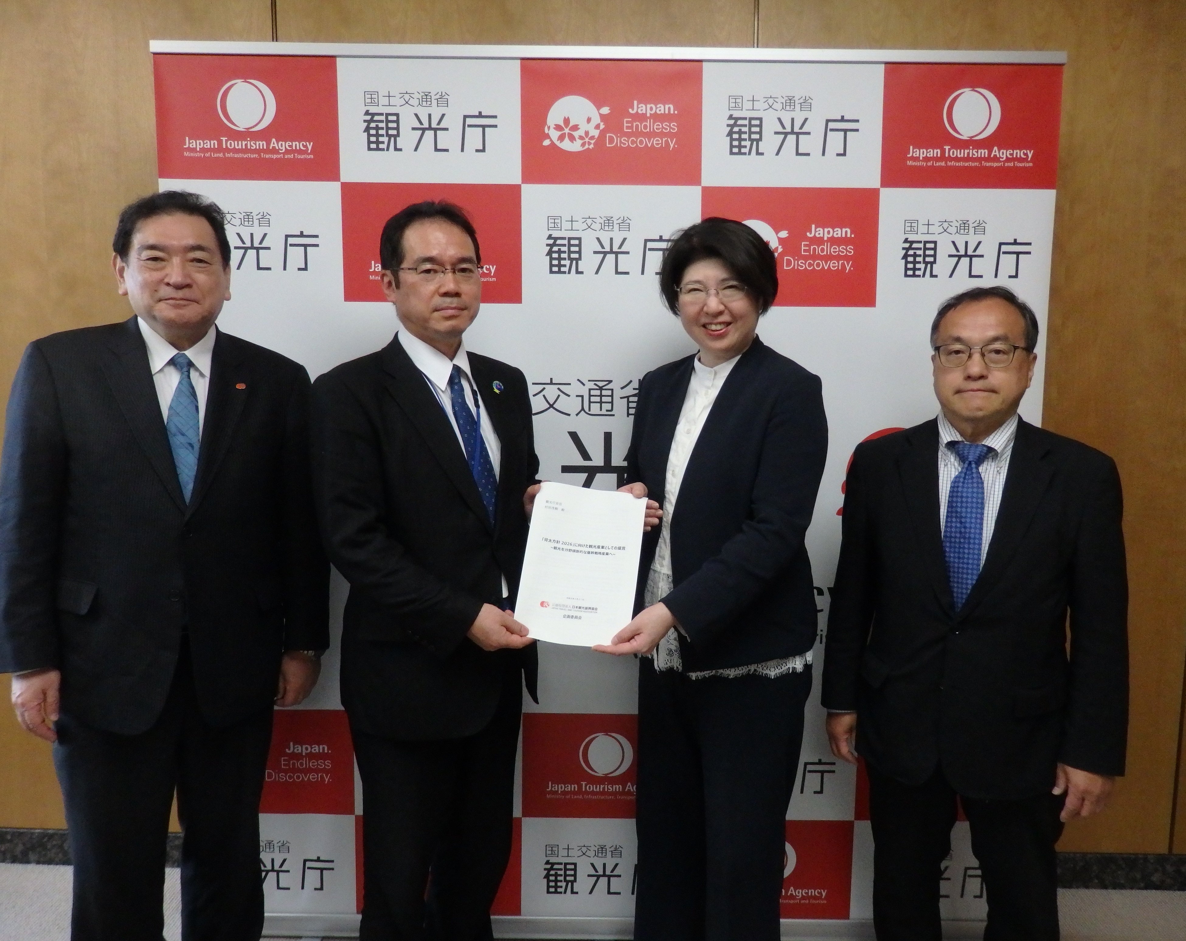 公益社団法人日本観光振興協会(東京都港区 会長 菰田 正信(三井不動産㈱代表取締役会長))企画委員会は、「経済財政運営と改革の基本方針2026」(骨太方針2026)に向けた提言を取りまとめ、西松千鶴子企画委員会委員長(㈱JTB取締役専務執行役員ツーリズム事業本部長)、最明仁理事長、長谷川豊副理事長が村田茂樹観光庁長官を訪問し、令和8年4月27日(月)に提出いたしました。