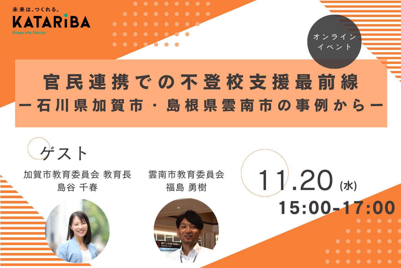 2015年から島根県雲南市から委託を受けて、教育支援センターを運営してきたカタリバ。2023年からは石川県加賀市の不登校支援全体をどう形作っていくかについても検討し、加賀市と一体で不登校支援施策を進めています。雲南市はアウトリーチなども含めた教育支援センターの最前線事例、加賀市は校内教育支援センターの整備から展開をはじめた不登校支援について、行政の方々をゲストに招きお話していきます。