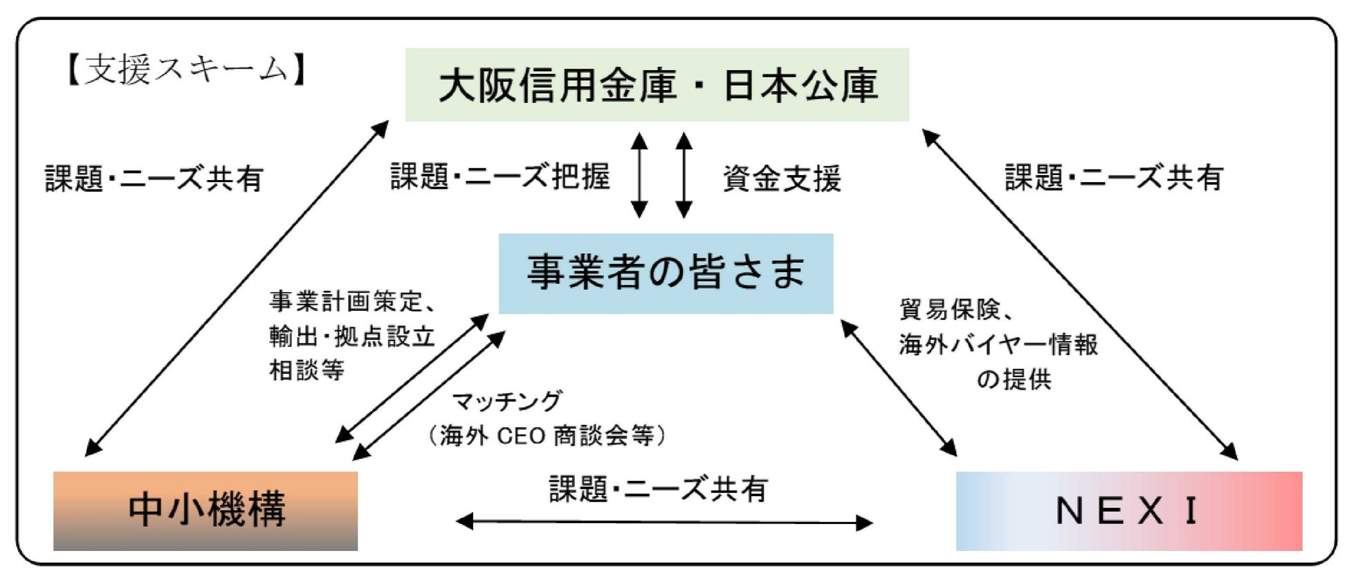大阪信用金庫(理事長 髙井嘉津義)は2023年8月25日(金)、海外展開に取り組む中小企業・小規模事業者の皆さまへの支援をより一層強化するため、日本政策金融公庫(以下、日本公庫)阿倍野支店、中小企業基盤整備機構(以下、中小機構)及び日本貿易保険(以下、NEXI)との間で、「海外ビジネス支援パッケージ」(以下、本スキーム)による連携を開始しました。