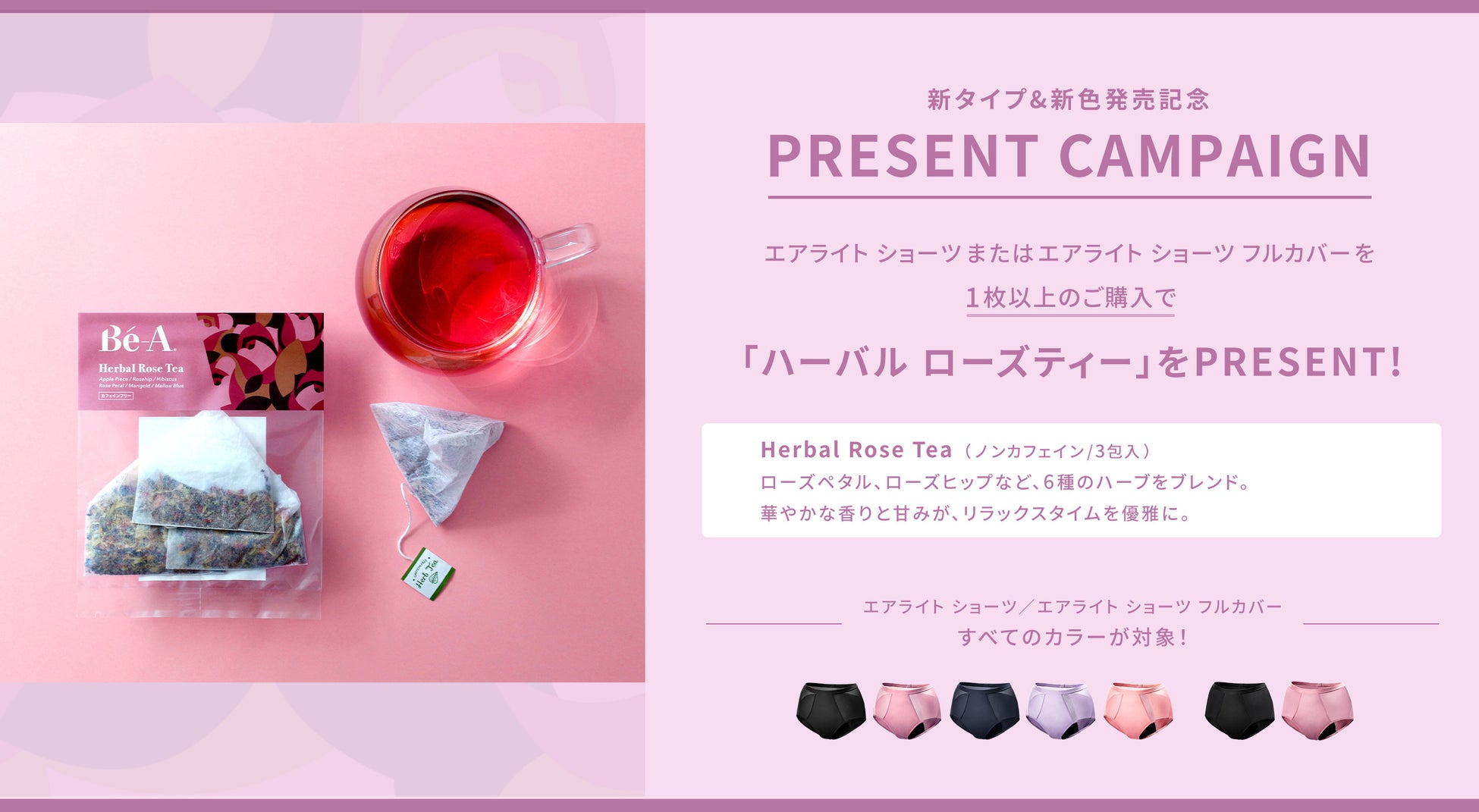 2024年12月10日(火)13:00から2025年2月10日(月)13:00まで、Bé-A〈ベア〉公式オンラインストアで「エアライト ショーツ」または「エアライト ショーツ フルカバー」を1枚以上のご購入いただいた方に 『ハーバル ローズティー』をプレゼント。