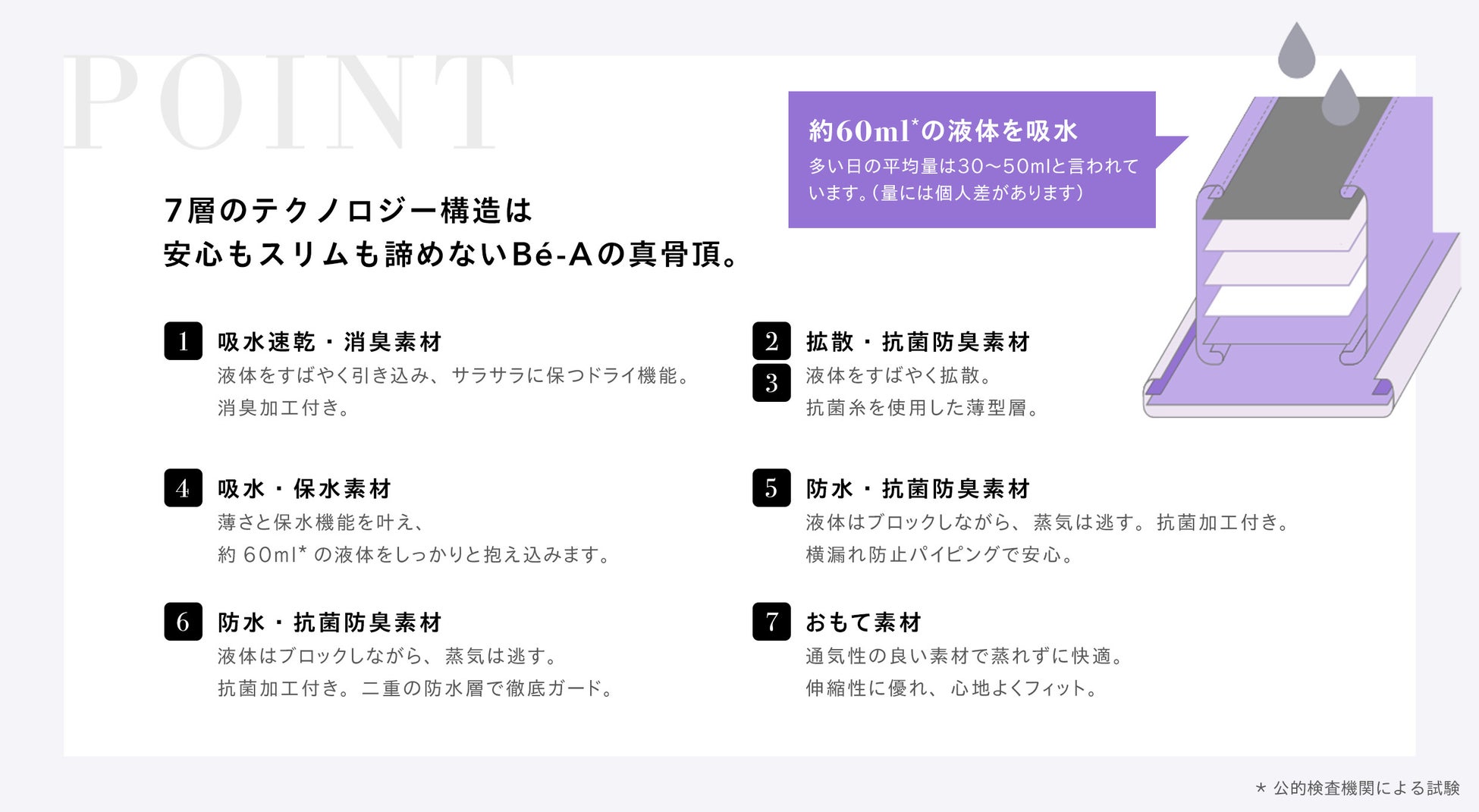 約60ml*¹の液体を吸水するショーツの秘密は、Bé-A〈ベア〉独自の設計。