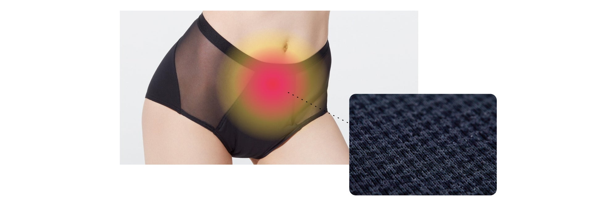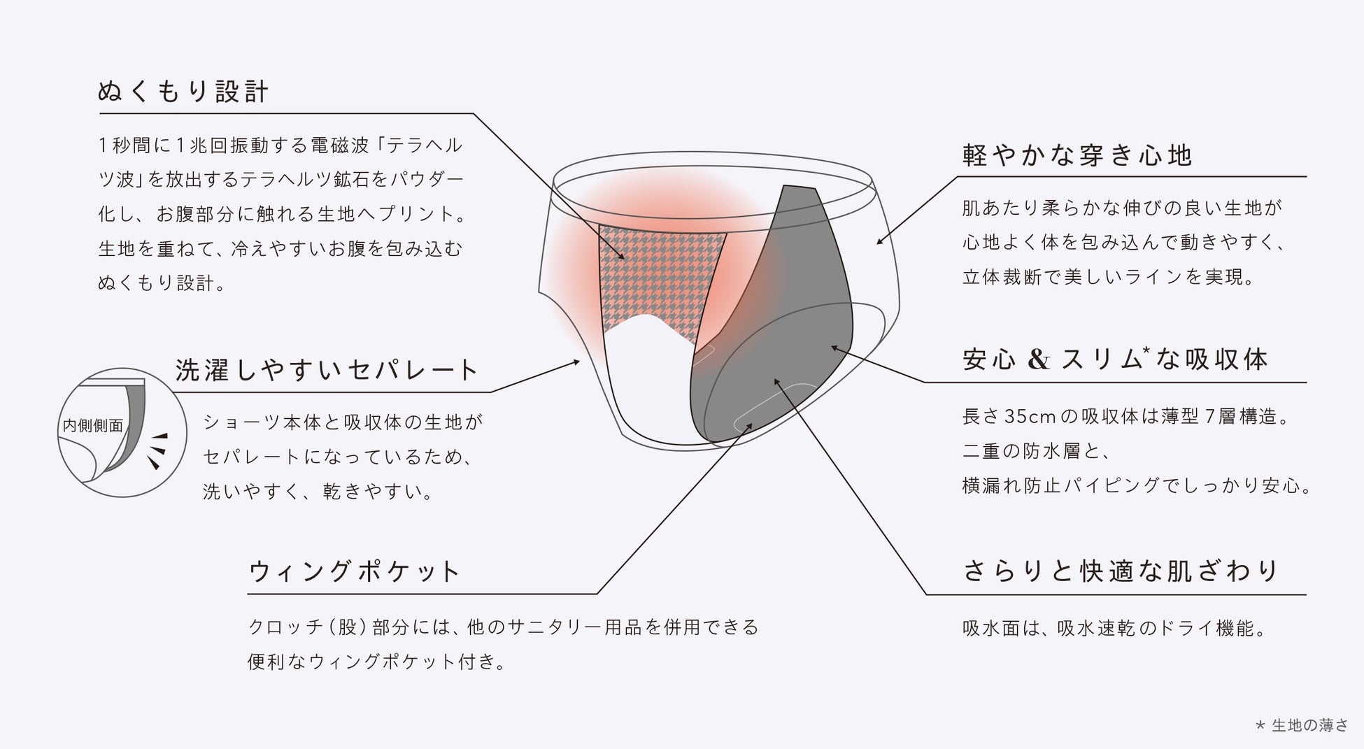 1秒間に1兆回振動する電磁波「テラヘル ツ波」を放出する テラヘルツ鉱石をパウダー化し、お腹部分に触れる生地へプリント。洗濯を繰り返しても落ちる心配はありません。重ねた生地が、冷えやすいお腹を包み込みます。