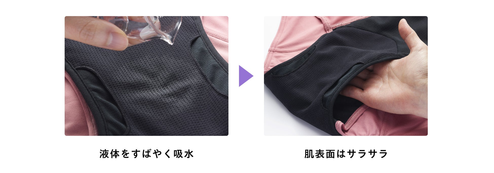 肌に触れる吸水面には、吸水速乾性に優れたドライ機能を持つ特殊なポリエステル素材を使用。液体をしっかり引き込み、すばやく発散するため、肌が触れる表面は常にサラサラです。綿100%の生地に比べて約半分の時間で乾くので、蒸れを減らしてベタつかず、ショーツの内側をドライに保ちます。