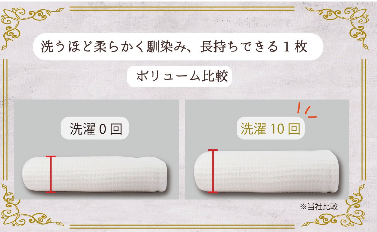 新品ケットと洗ったケットを比較するとボリュームが格段に変わります。エンジェルスピン使用で硬くなりにくく、やわらかい風合いが長持ちします。そしてワッフル織なのに縮みにくいのもポイントです!