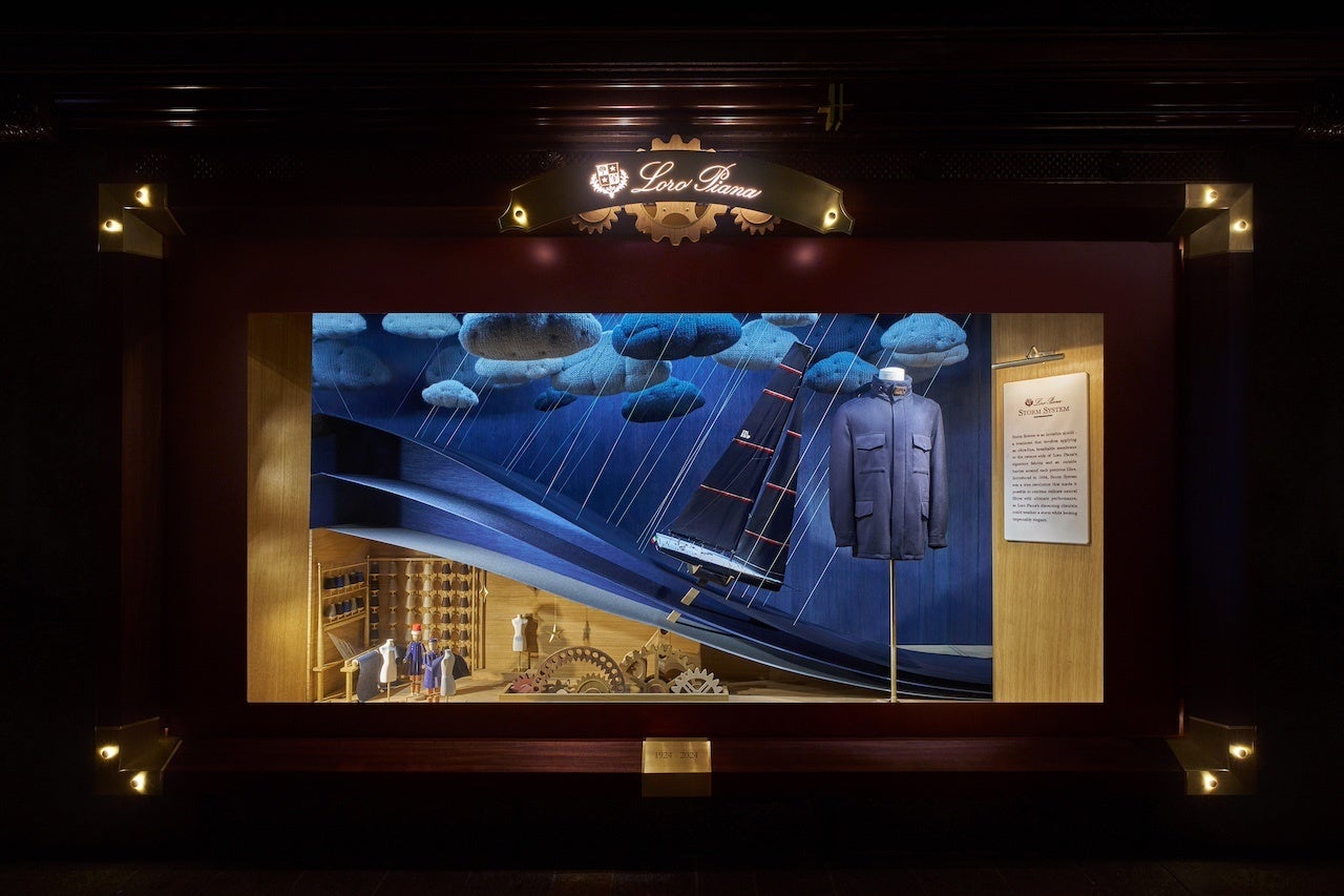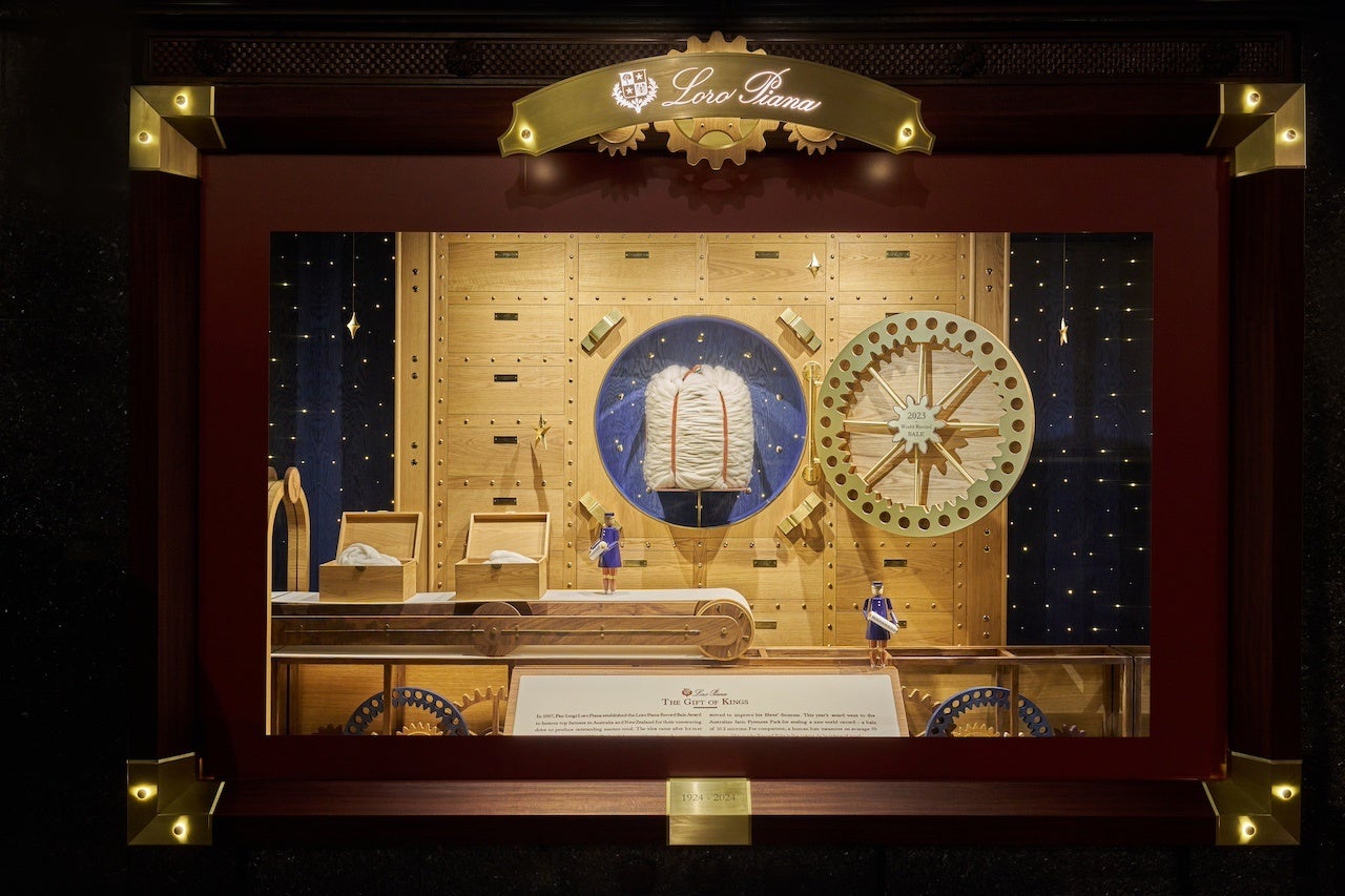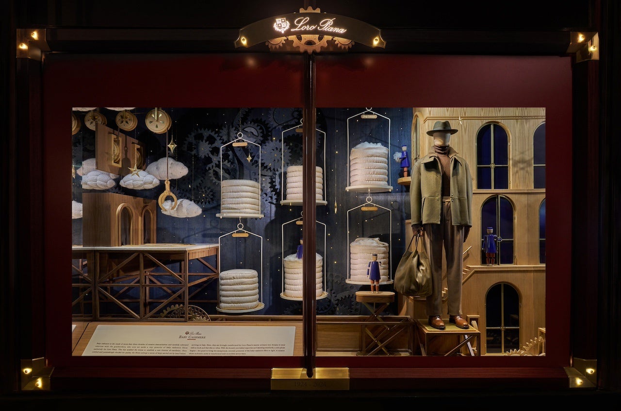 メインウィンドウでは、イタリアのクアローナにあるロロ・ピアーナの工場のミニチュアの上に回転する地球儀が飾られます。そこには繊維の達人たちの産地と、その地までの旅路が示されます。地球儀の上の雲には象徴的なハロッズのグリーンマンが座り、ハロッズとロロ・ピアーナの長年の結びつきを象徴しています。