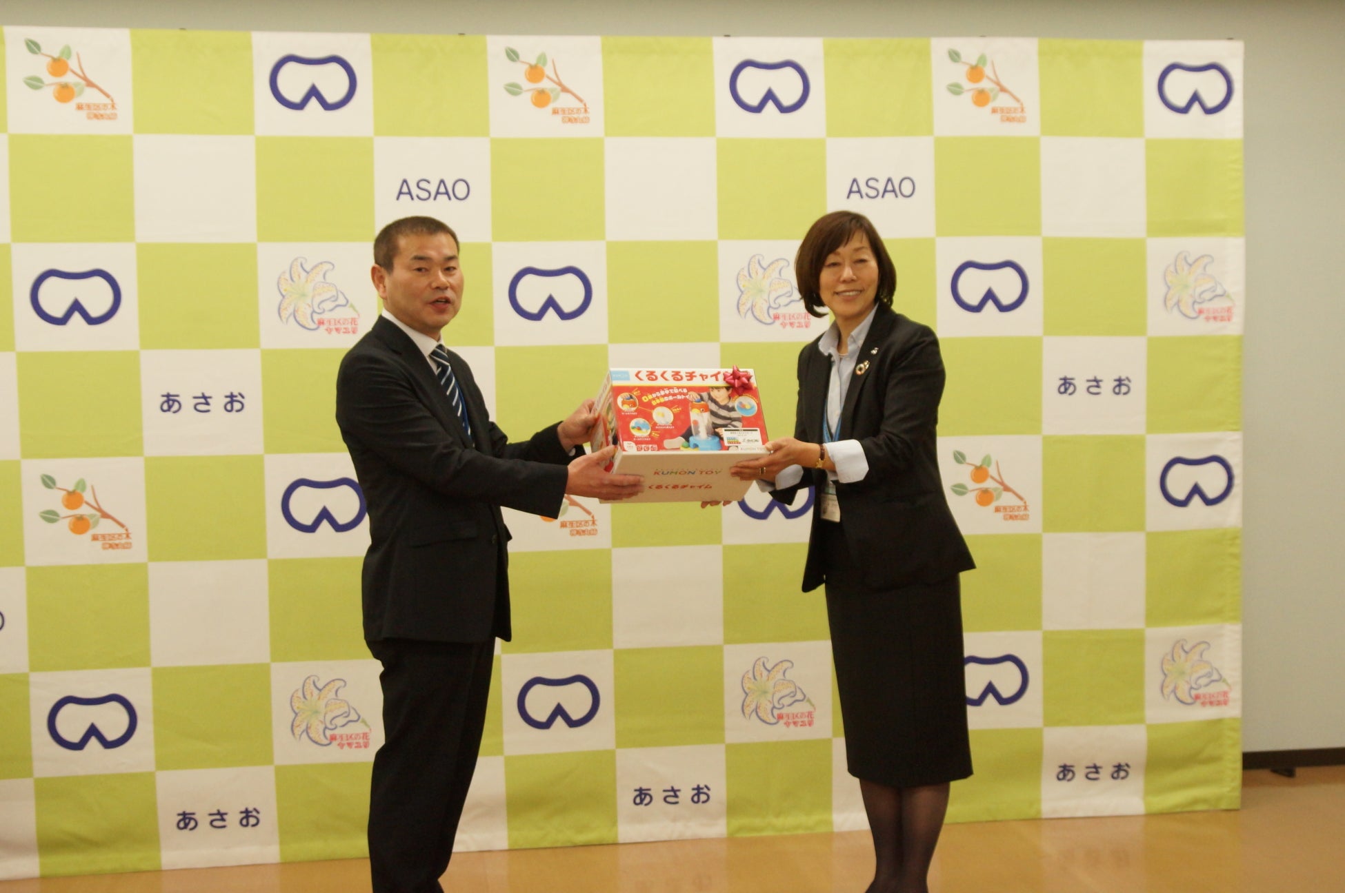 寄贈にあたり、麻生区長 三瓶 清美様からは、「新しいおもちゃは貴重で嬉しい。健診などに来るお子さまも喜ぶと思う。」というコメントを頂きました。