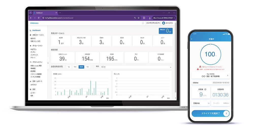 「EMOVision」は、課金サービスを必要としない法人内でのEV充電利用に特化したサービスです。充電に要した電気量や料金、部署単位やドライバー単位で集計分析を行えるプラットフォームを提供します。また、充電器を遠隔でデマンドコントロールし、電気料金削減に貢献します。