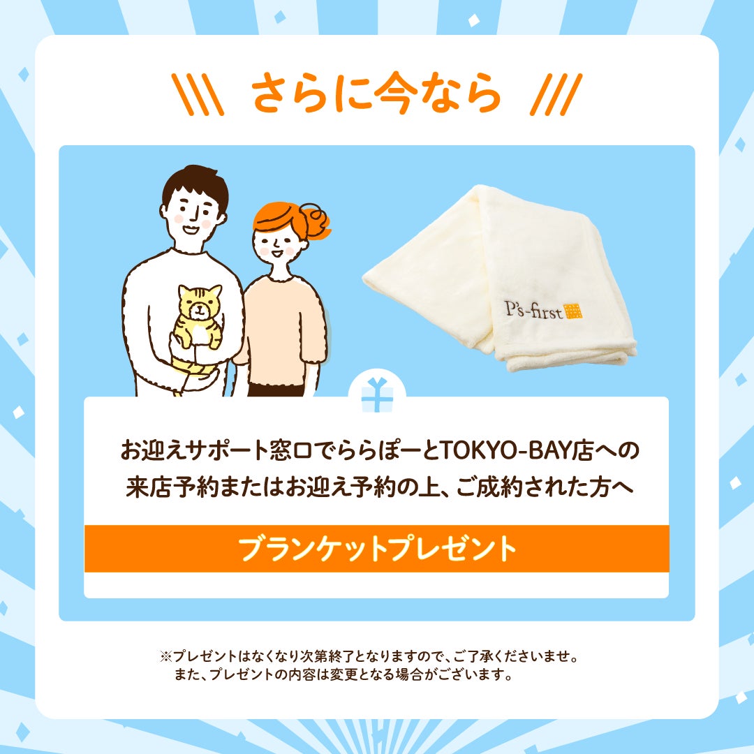 お迎えサポート窓⼝にて来店予約またはお迎え予約の上、ららぽーとTOKYO-BAY店でご成約された⽅へ、ワンちゃん・ネコちゃん⽤のブランケットをプレゼント