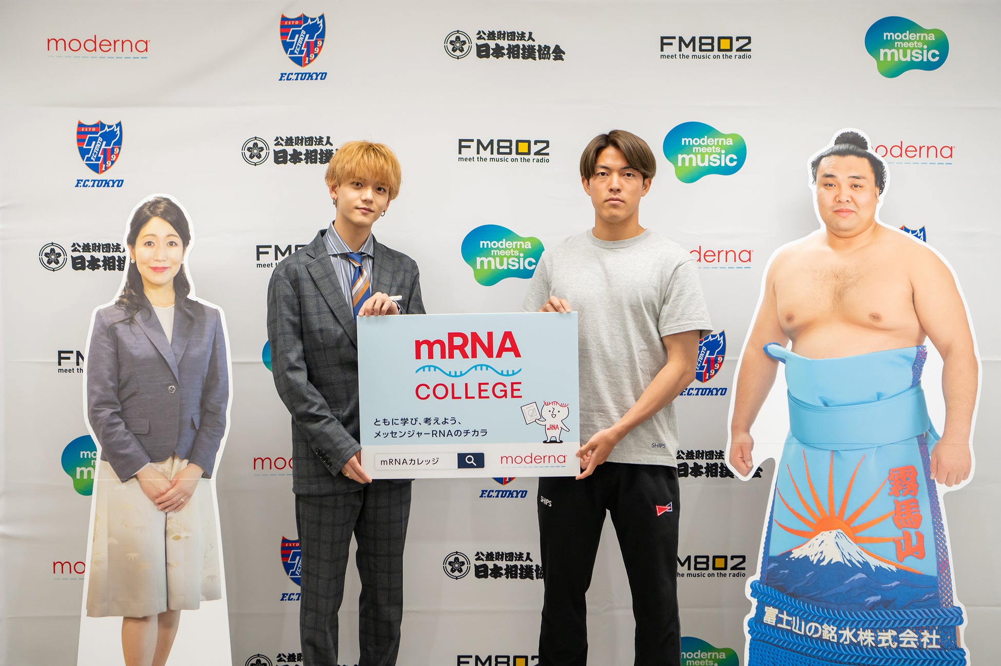 またmRNAカレッジ開設にあわせて、5月24日(水)にJリーグFC東京の味の素スタジアムで、mRNAカレッジの活動に参加していただくメンバーと共にメディアセミナーとキックオフイベントを実施いたしました。会場には、これまでもモデルナ・ジャパンとさまざまな形でコラボレーションを行ってきた日本相撲協会から霧馬山関(陸奥部屋・本場所中のためビデオでの登壇)、FC東京の西堂久俊さん、FANTASTICS中島颯太さん、司会として大阪発信のラジオ局FM802の飯室大吾さんが登壇いたしました。mRNAカレッジ開設について、それぞれの代表は以下のように述べています。