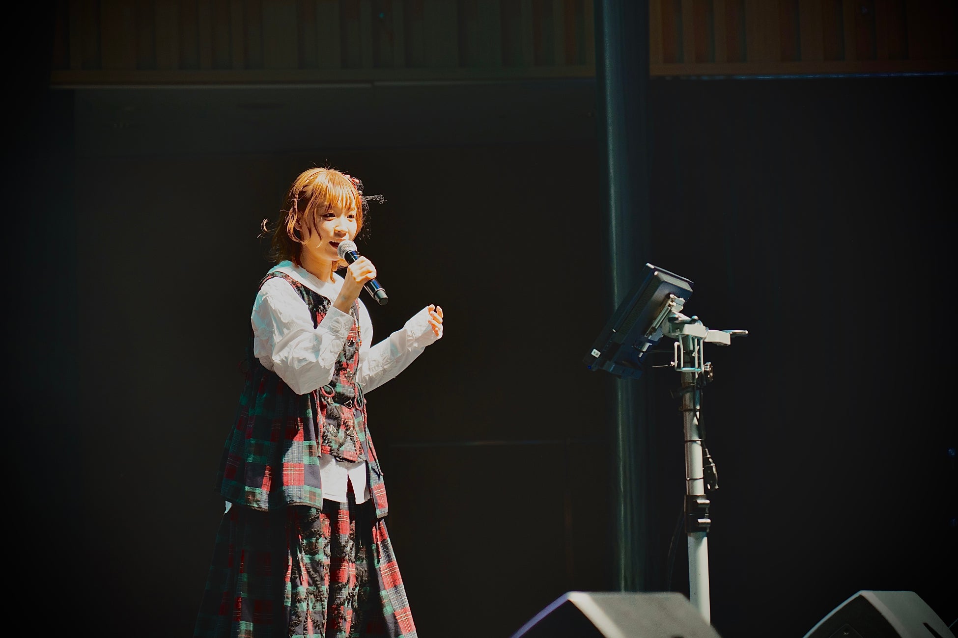 イベントはモモコグミカンパニーさんの影アナウンスからスタート。「みなさん、後ろですよー!」という声が聞こえると、会場後方の扉から姿を現し、ファンたちから驚きと歓声が上がりました。クリスマスカラーのチェック柄がキュートなセットアップ姿で手を振りながらステージへ向かい、「モモコグミカンパニーです!平日月曜日の昼間に来てくれてありがとうございます!お仕事は大丈夫ですか?有給を取った方もいるのかな?」と、ユーモアを交えた挨拶で幕を開けました。