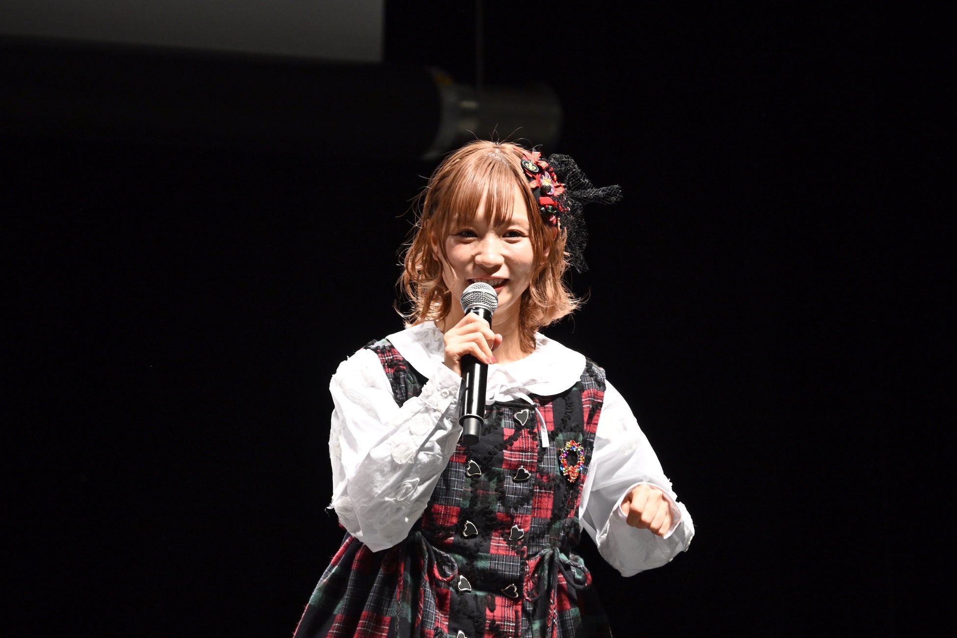 1部では、サイン&お名前入りのブロマイドやMclub準公式キャラクター『かなるくん』のステッカーが。2部では、1部で当たらなかった私物を1等に引き継ぎ、1部と同様、メッセージ入りのブロマイドと『かなるくん』ステッカーに加えて、2部のために用意された等身大パネルがプレゼントされました。イチオシは、なんといっても1等の私物。モモコグミカンパニーさんがみんなのモチベーションを上げるために3つほど用意したという景品。「まず、じゃんっ。これは今年の春くらいにXに投稿して、みんなかわいいと言ってくれたカチューシャ。もうひとつは、私が気に入って買ったコジコジのマスコットキーホルダー。それと昔、使っていたスマホケースです(笑)。機種変したので、でも、こだわりがあって、鏡になっているのと小文字でエムと書いてあります。パッと見た感じ、私の手と同じくらいの大きさです」。スペシャルな景品を愛くるしく説明する場面に、会場もどっと笑いが起きました。