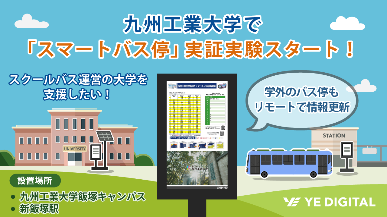 株式会社YE DIGITALはこの度、国立大学法人九州工業大学(※1、以下 九州工業大学)が運営するスクールバスのバス停がある飯塚キャンパス・新飯塚駅に「スマートバス停」を設置し、西日本鉄道株式会社(※2、以下 西日本鉄道)と連携した実証実験を、2023年6月1日(木)より開始いたします。