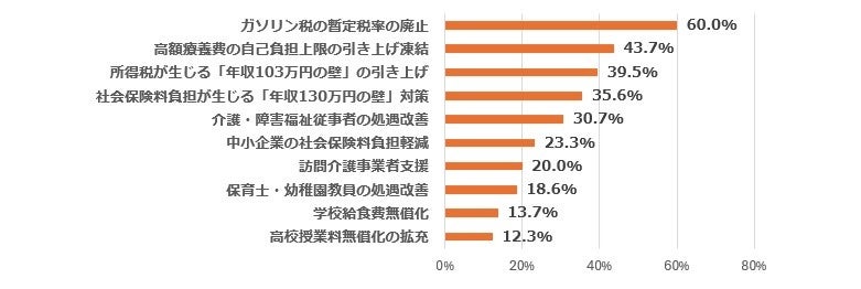 立憲民主党、日本維新の会、国民民主党の3党がそれぞれ25年度予算案で修正を求めた主な項目のうち、最も実現してほしいと思う政策を複数回答で聞くと、ガソリン税の暫定税率廃止が60.0%で最多となり、高額療養費の自己負担上限の引き上げ凍結が43.7%、所得税が生じる「年収103万円の壁」の引き上げが39.5%と続いた。