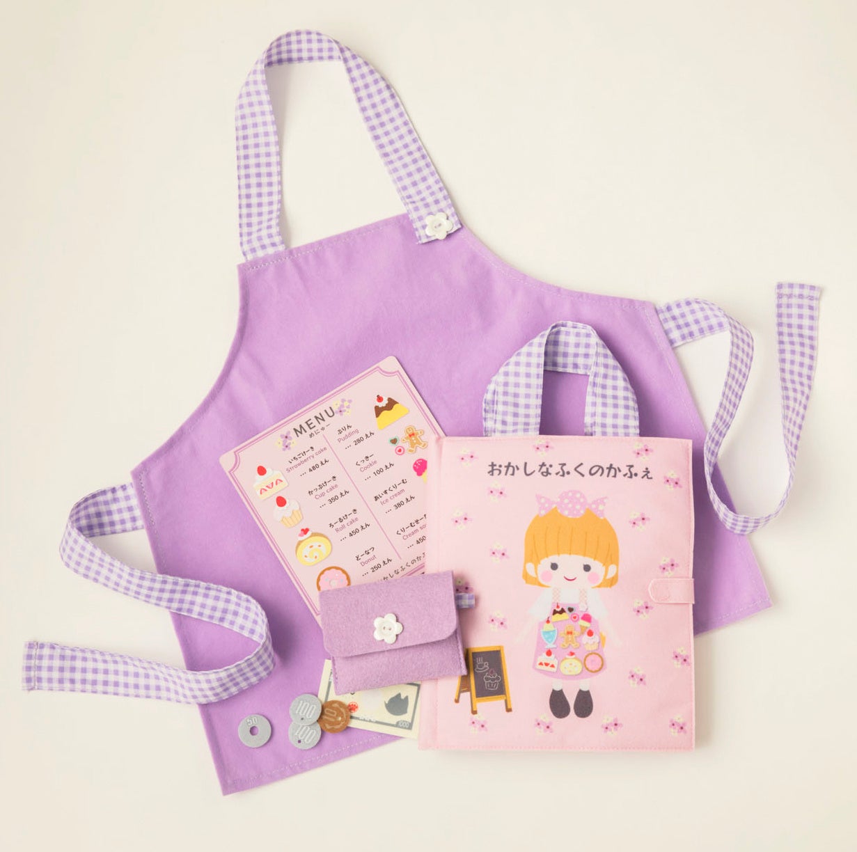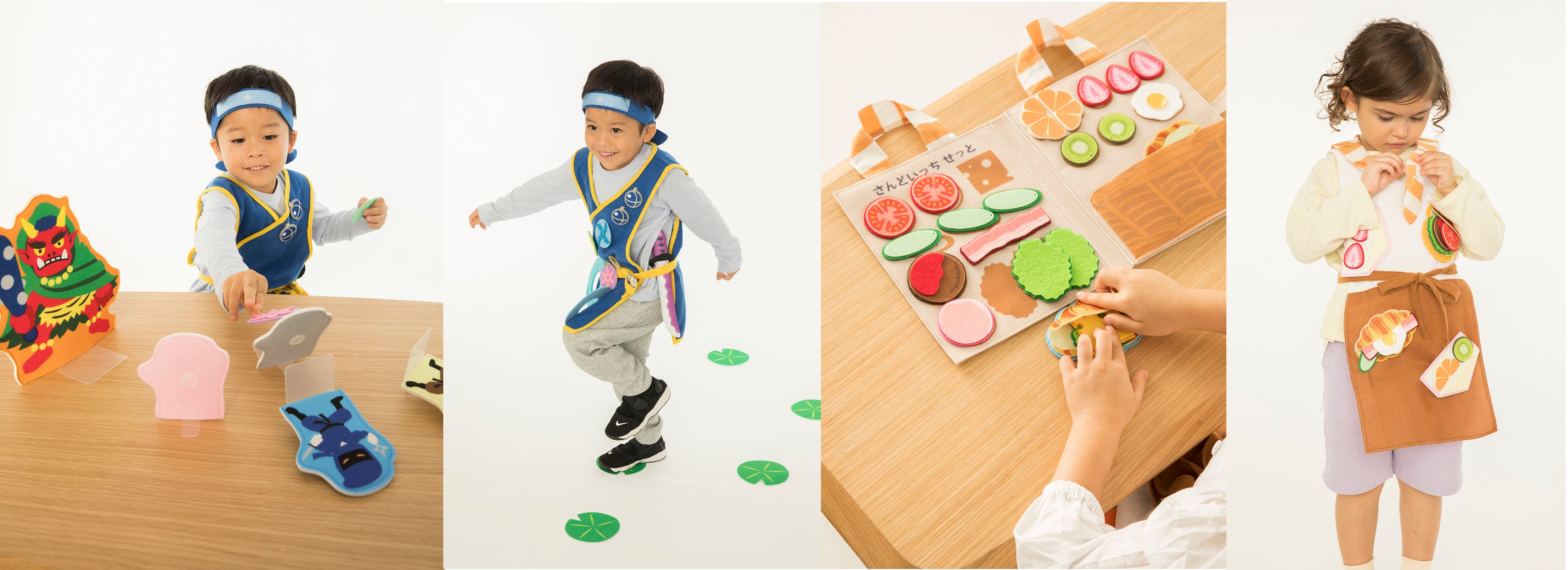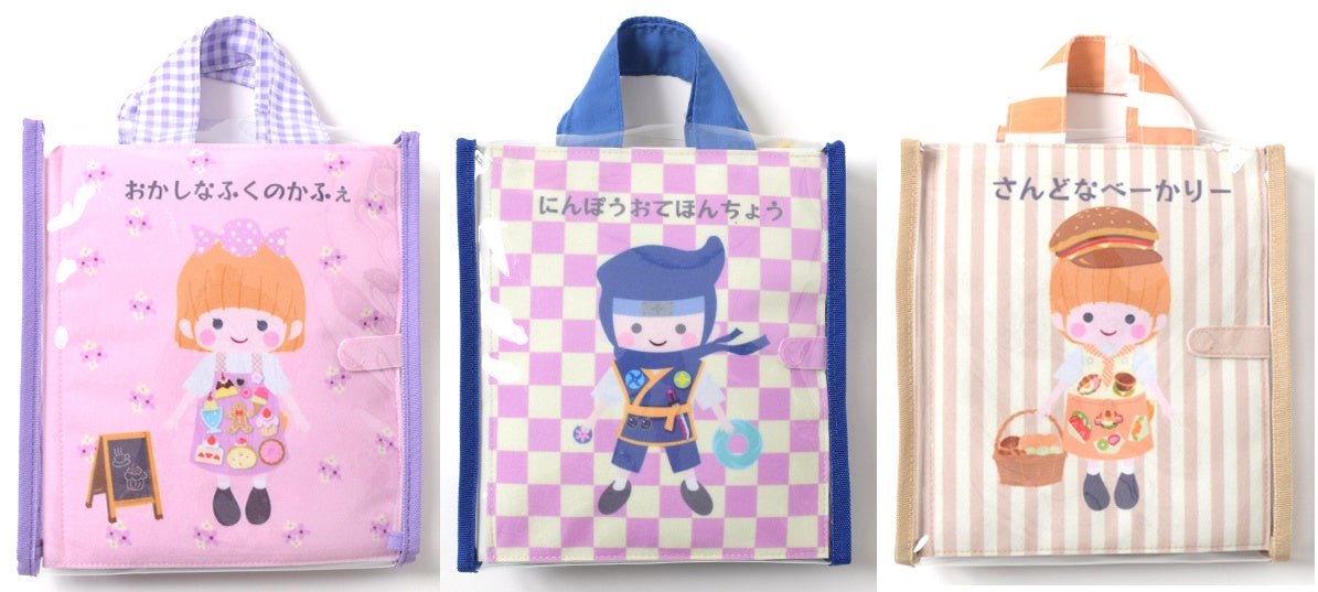 「なりきりエプロン」と「フェルト小物」が絵本に集約され、バッグのように持ち運びが可能で、いつでもどこでも子どもが楽しめる「なりきりごっこ遊び」ができるのが特徴です。