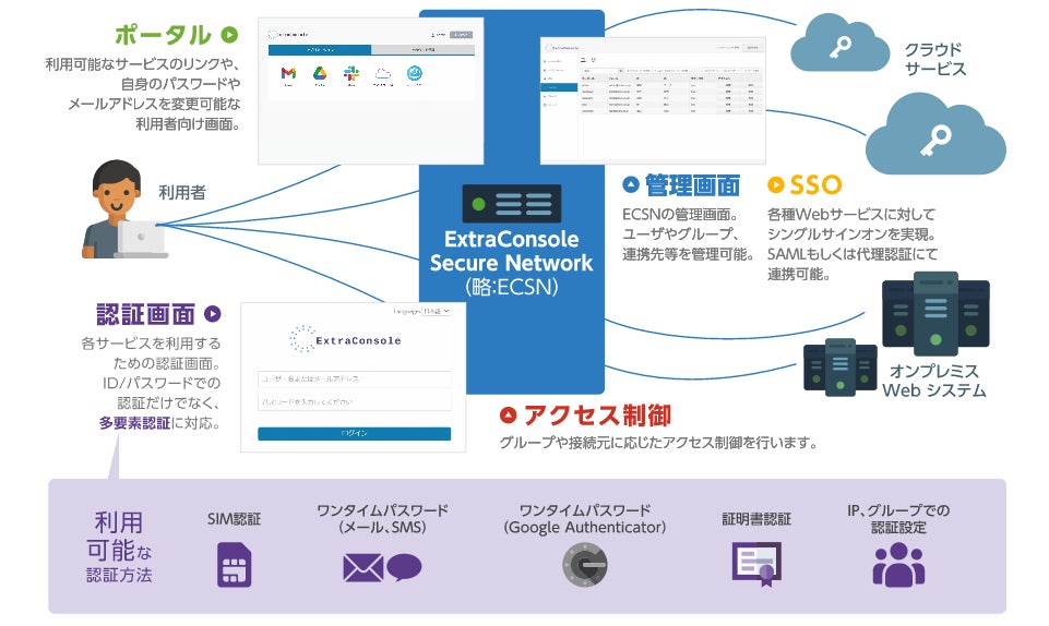『ExtraConsole® Secure Network』は、1度のIDとパスワードの入力で、クラウドサービスや各種WebサービスにアクセスできるSSO(シングルサインオン)システムです。今回のバージョンアップにより、ID・パスワードと多要素認証を組み合わせてセキュリティ強化を図ることが可能になりました。もちろん、SIM認証やワンタイムパスワードなど様々な認証方式を組み合わせることもできます。
