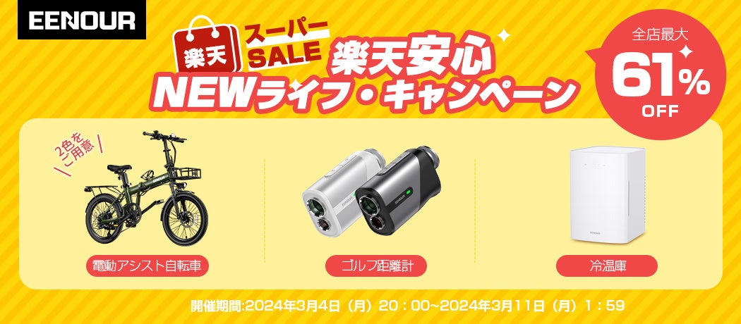 EENOUR楽天市場店では、3月4日から3月11日まで特別な防災支援セールを開催します。この期間中、ポータブル電源、インバーター発電機、ゴルフ用レーザー距離計など、厳選された防災関連商品を最大61%OFFで提供します。