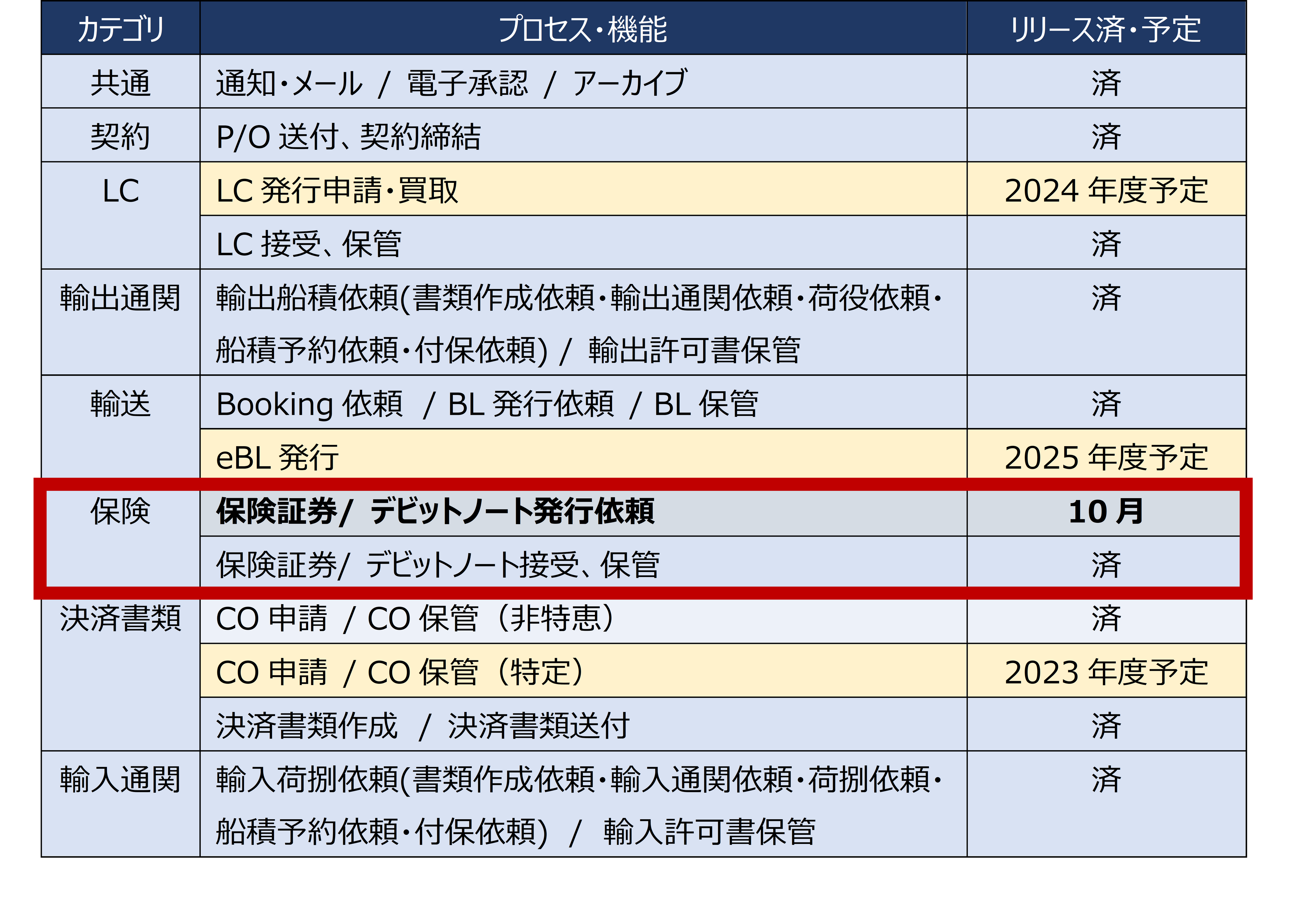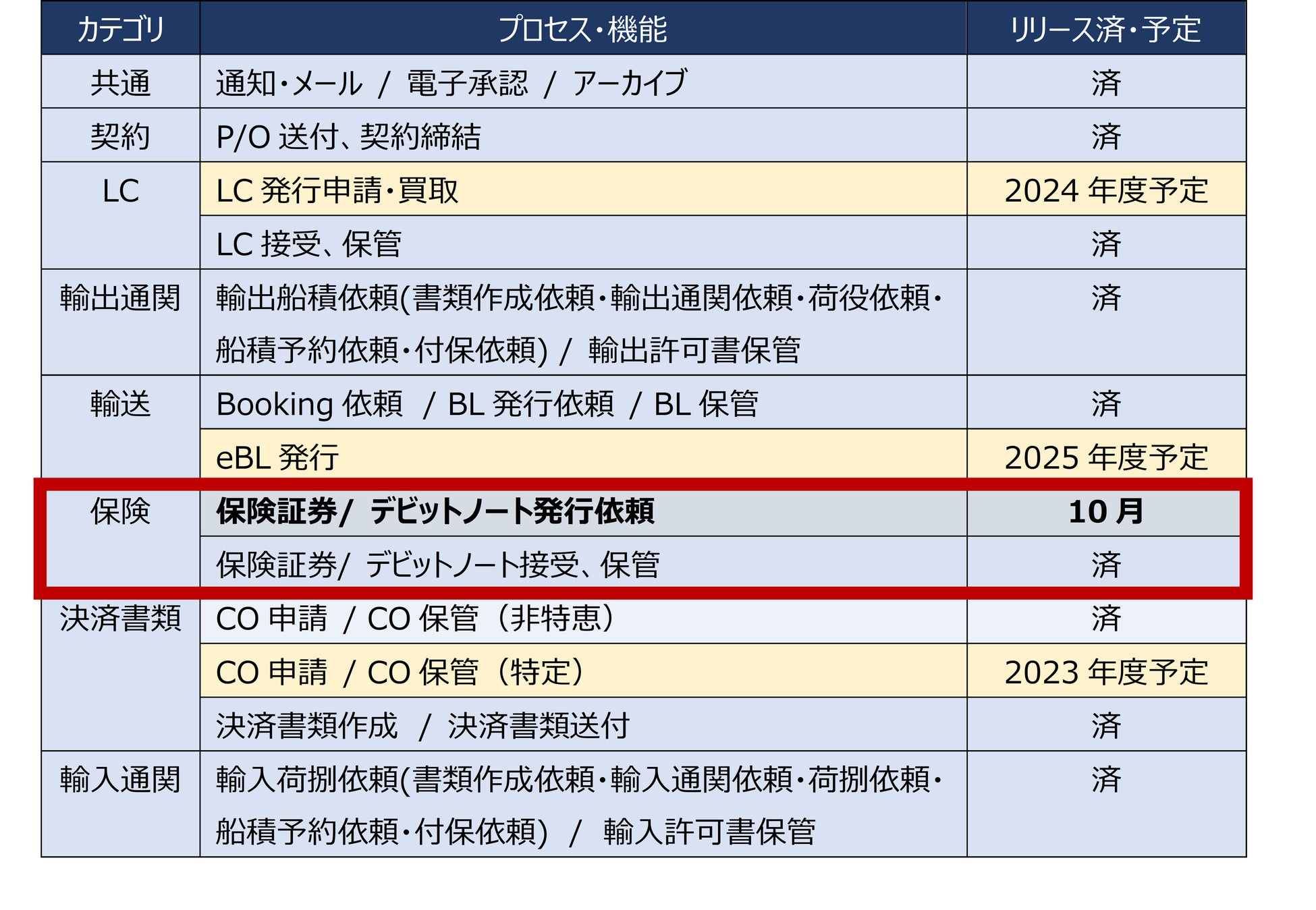 TradeWaltzは更に貿易の適用業務と機能の拡充を進めており、7月からは保険機能も一部実装できたため、東京海上日動及び損保ジャパンの2社が、8月に商用利用を開始しました。