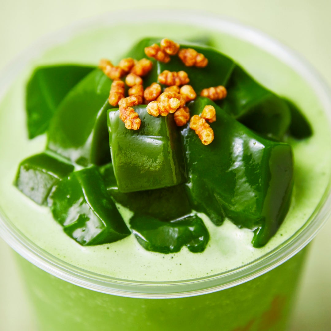 『濃い 天空の抹茶 ショコラドリンク』は、天空の抹茶の中でも収量が少ない、最上位クラスの「90号」の天空の抹茶をドリンク部分に使用しています。抹茶の持つ旨味、色、香り、そして心地よい苦味を、リンツのホワイトチョコレートとともにお楽しみいただけます。ぷるんとした抹茶わらびもち、香ばしい玄米をアクセントに、多彩な抹茶を味わえる一杯です。