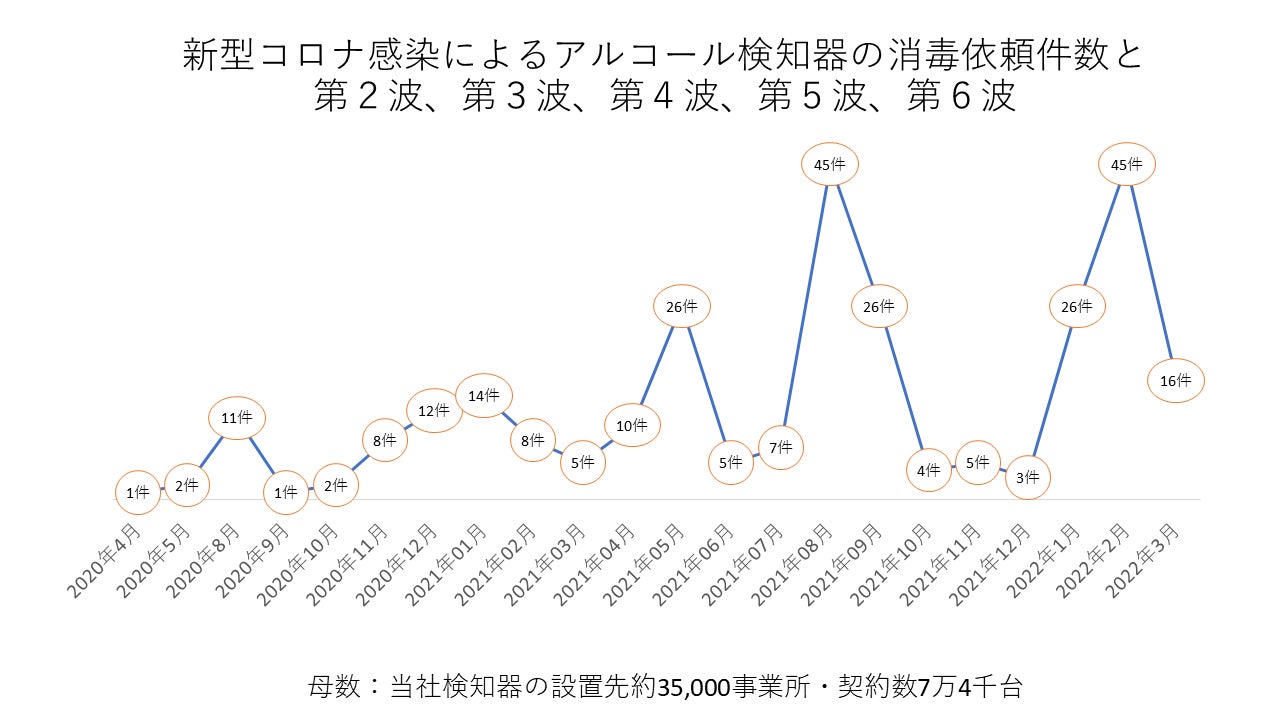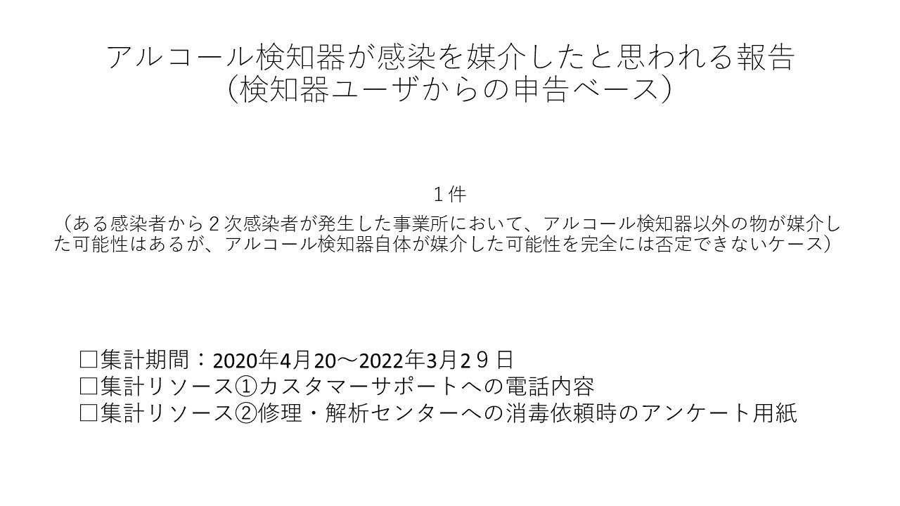 1⽉から3⽉にかけて、唯⼀⼀件、アルコール検知器使⽤場所、アルコール検知器由来(接触感染なのか、エアロゾル感染的なのか、科学的検証は出来ないにせよ)を否定できないとの⾒解をもつ事業所がいらっしゃいました。
