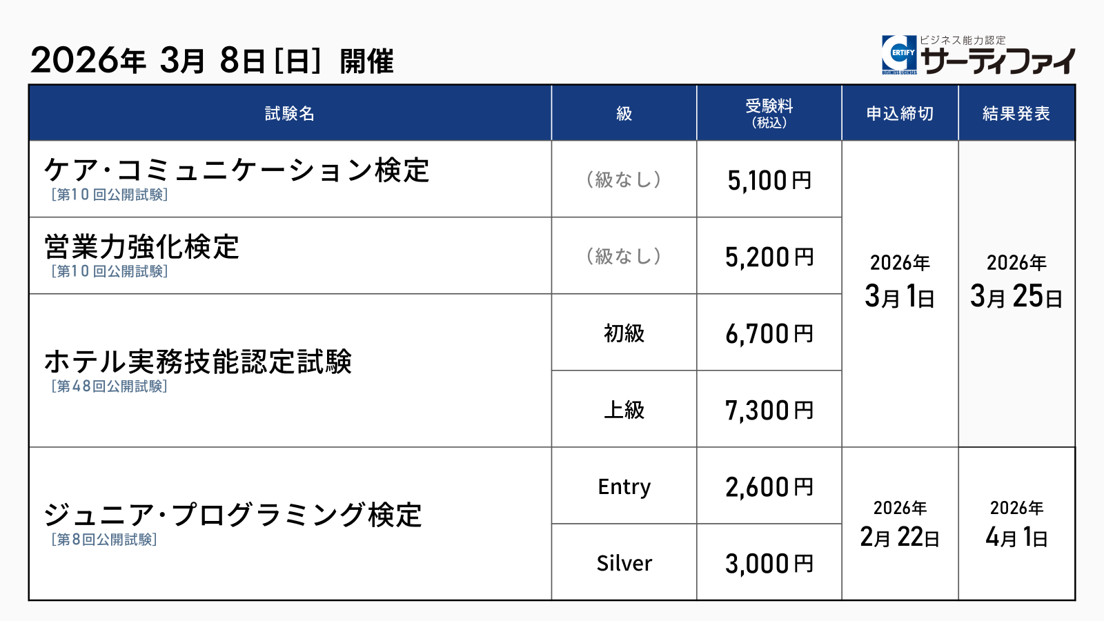 株式会社サーティファイ(本社:東京都中央区、代表取締役:瀧澤茂、以下「サーティファイ」)は、2026年3月8日(日)に開催する「ケア・コミュニケーション検定」「営業力強化検定」「ホテル実務技能認定試験」「ジュニア・プログラミング検定」の公開試験の申込受付を2025年12月23日より開始しました。なお、「ジュニア・プログラミング検定」は、2026年3月8日の開催を最後に、公開試験を終了いたします。