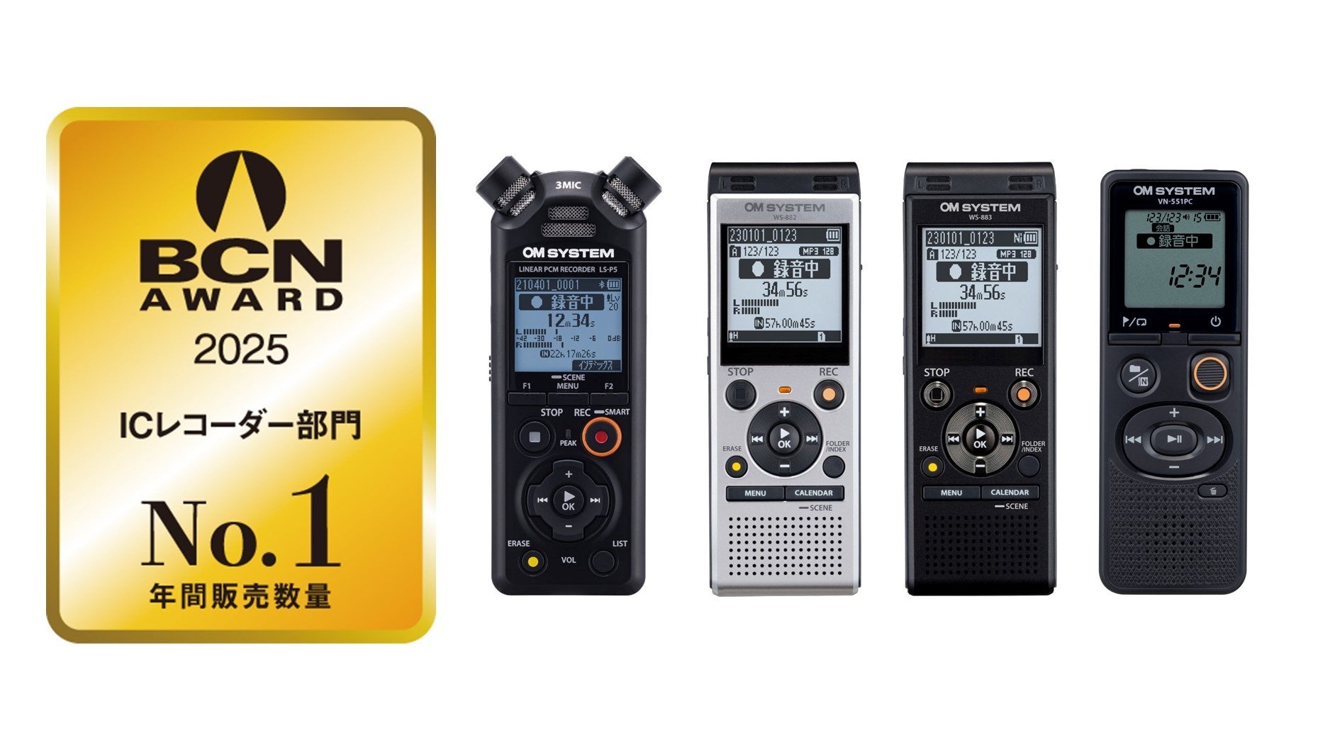 OMデジタルソリューションズ株式会社(代表取締役社長 兼CEO:杉本 繁実)が展開する映像製品ブランド「OM SYSTEM」は、株式会社BCN主催の「BCN AWARD 2025 ICレコーダー部門」において、国内年間販売数量 No.1を受賞したことをお知らせします。この度の受賞により、当社のICレコーダーは10年連続(※1)で日本国内年間販売数量No.1を達成し、2024年の国内年間販売数量シェア41.7%(※2)を獲得しています。