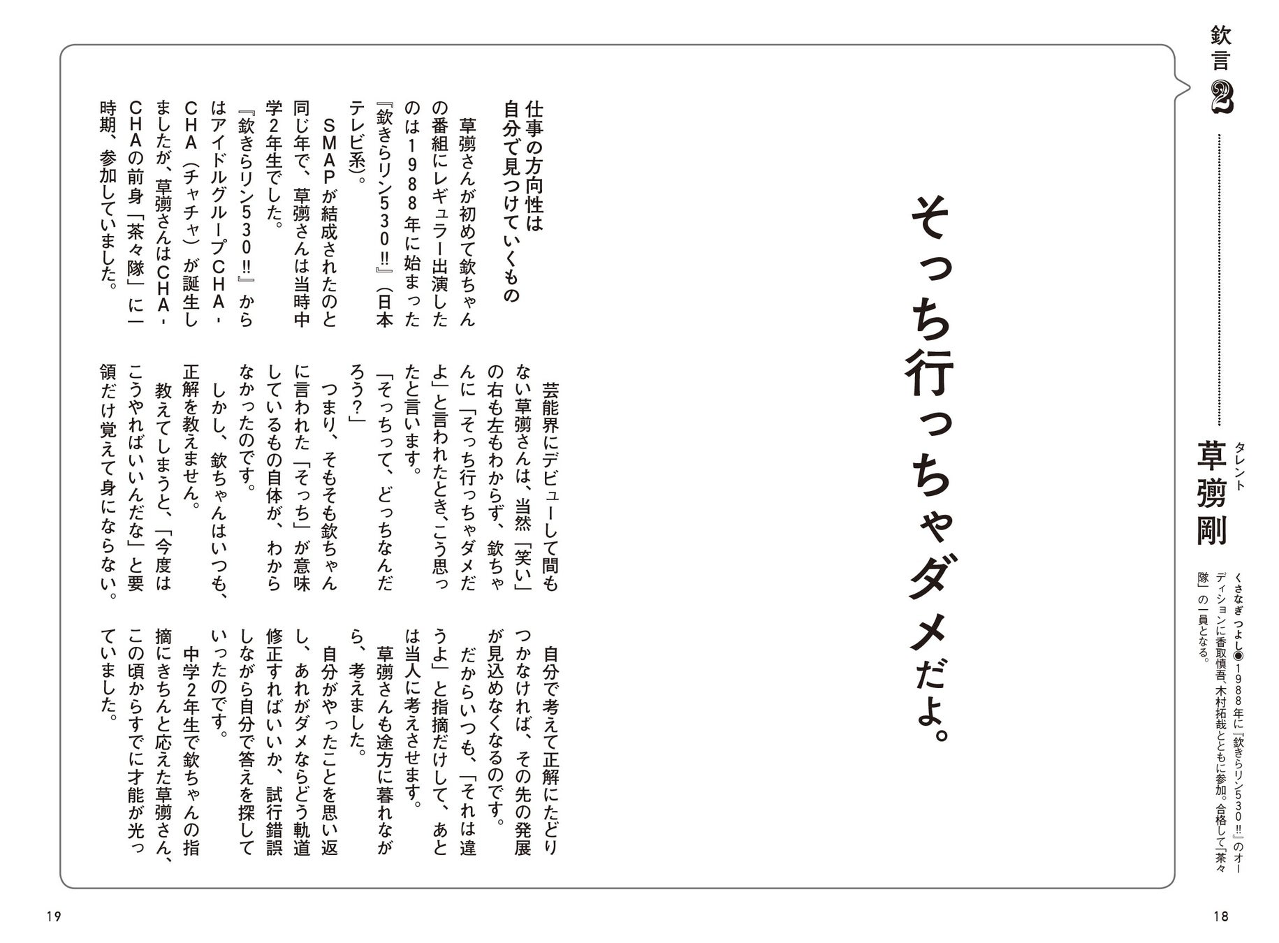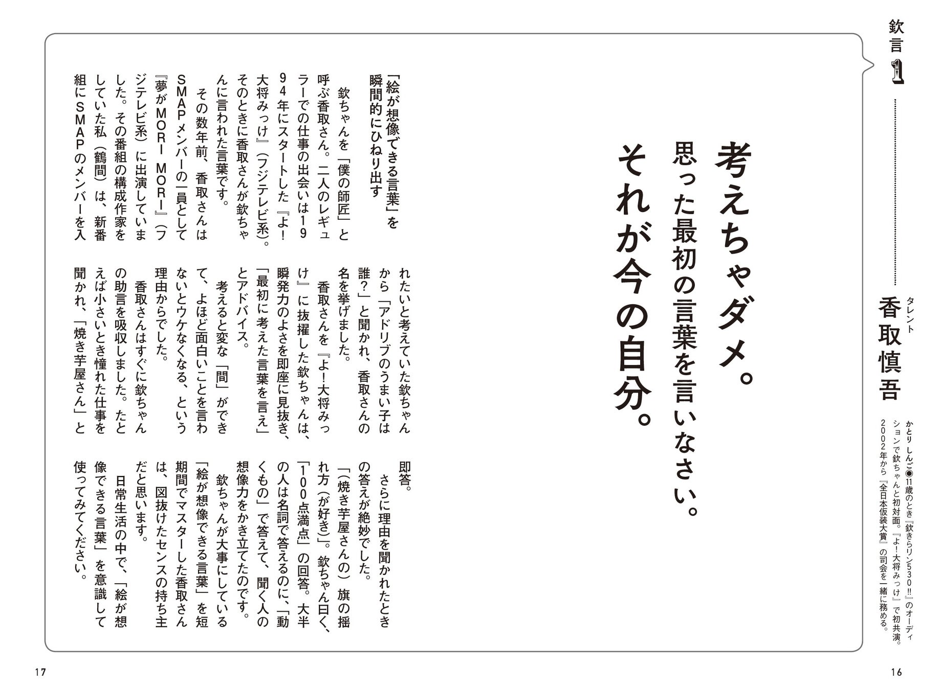 その数年前、香取さんはSMAPメンバーの一員として「夢がMORI MORI」(フジテレビ系)に出演していました。その番組の構成作家をしていた私(鶴間)は、新番組にSMAPのメンバーを入れたいと考えていた欽ちゃんから「アドリブのうまい子は誰?」と聞かれ、香取さんの名を挙げました。香取さんを「よ!大将みっけ」に抜擢した欽ちゃんは、瞬発力のよさを即座に見抜き、「最初に考えた言葉を言え」とアドバイス。考えると変な「間」ができて、よほど面白いことを言わないとウケなくなる、という理由からでした。