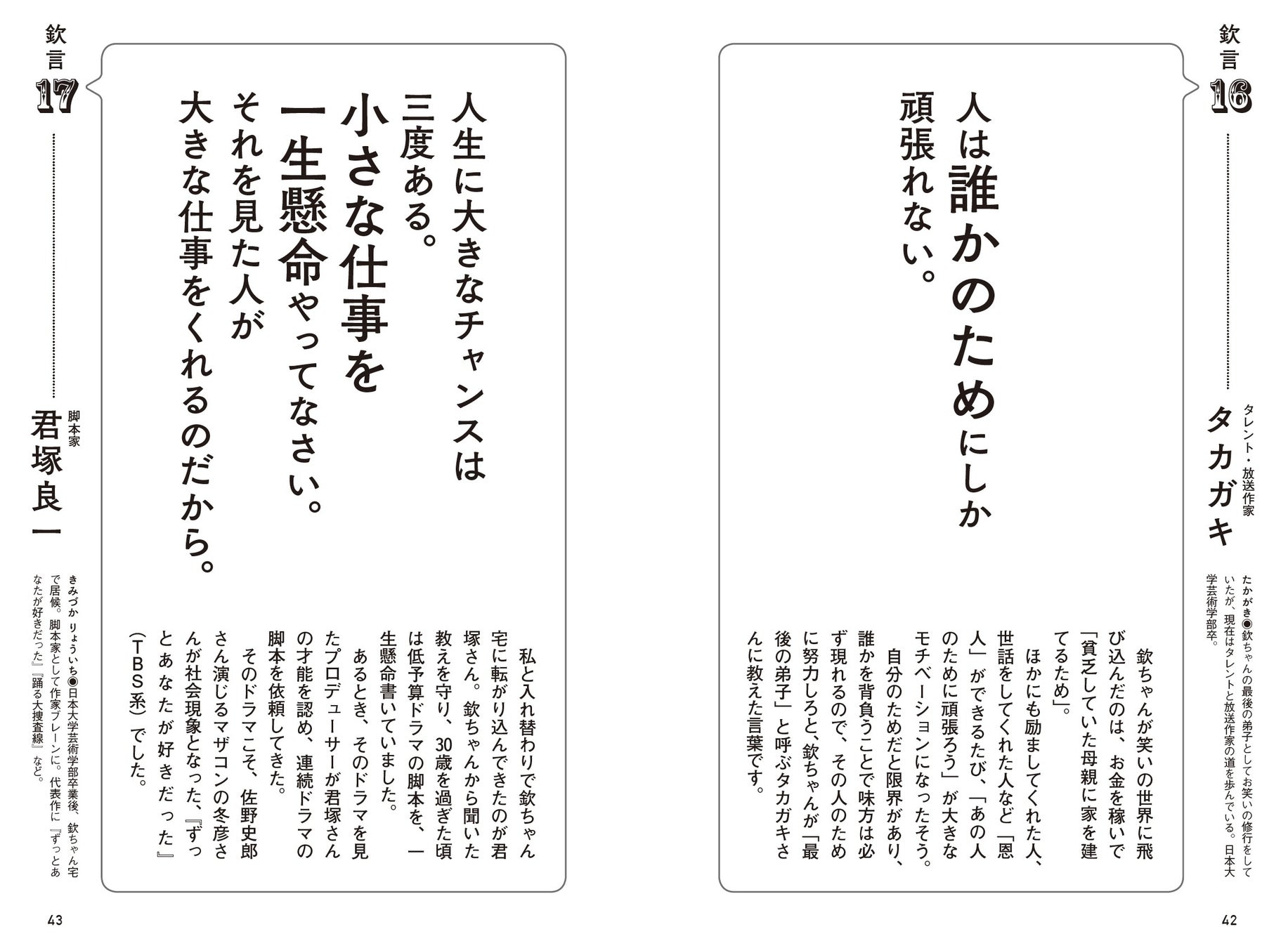 などなど、欽ちゃん(萩本欽一)に関わってきた69名に、欽ちゃんに教わったことや印象に残っている言葉を、欽ちゃんのブレーンとして47年間一緒に歩んできた放送作家が総力取材。その人たちの人生を好転させた、欽ちゃん語録(欽言)を一冊にまとめました。人生を歩んでいくために必要な、「人間力」の源にもなる言葉がこの本の中にぎゅっと詰まっています。